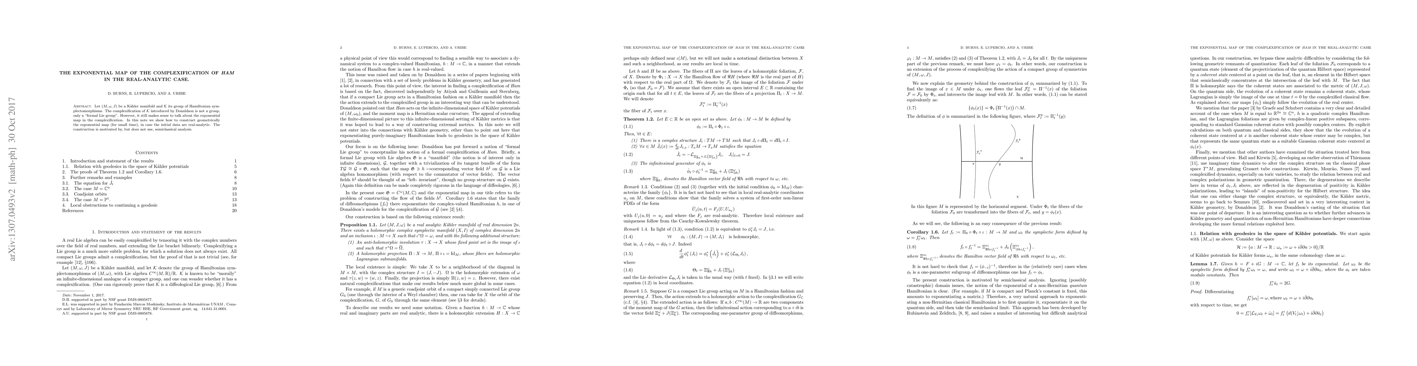 Let $(M, \omega, J)$ be a K\"ahler manifold and K its group of hamiltonian symplectomorphisms. The complexification of K introduced by Donadson is not a group, only a "formal Lie group". However it still makes sense to talk about the exponential map in the complexification. In this note we show how to construct geometrically the exponential map (for small time), in case the initial data are real-analytic. The construction is motivated by, but does not use, semiclassical analysis.