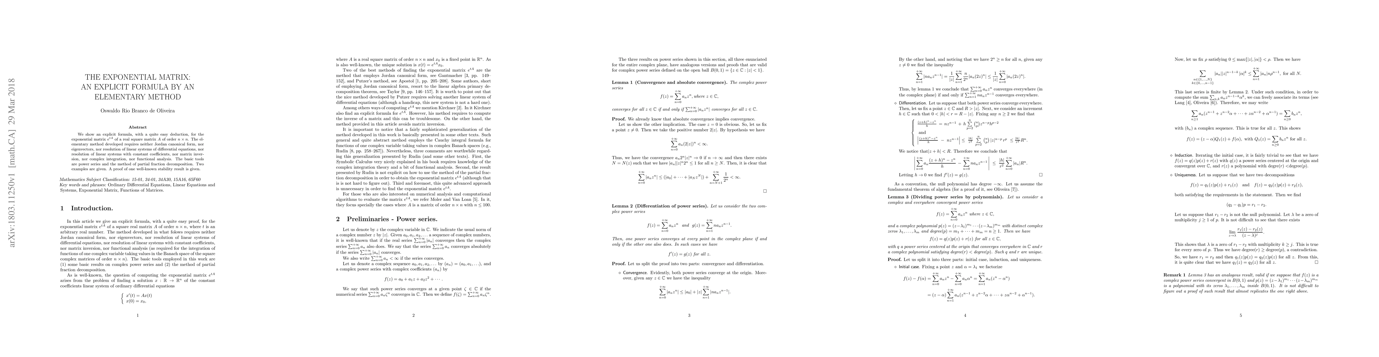 This paper presents an elementary method to derive an explicit formula for the matrix exponential $e^{tA}$ using power series and partial fraction decomposition, avoiding complex techniques like matrix inversion or functional analysis. It includes two examples and proves a known stability result.