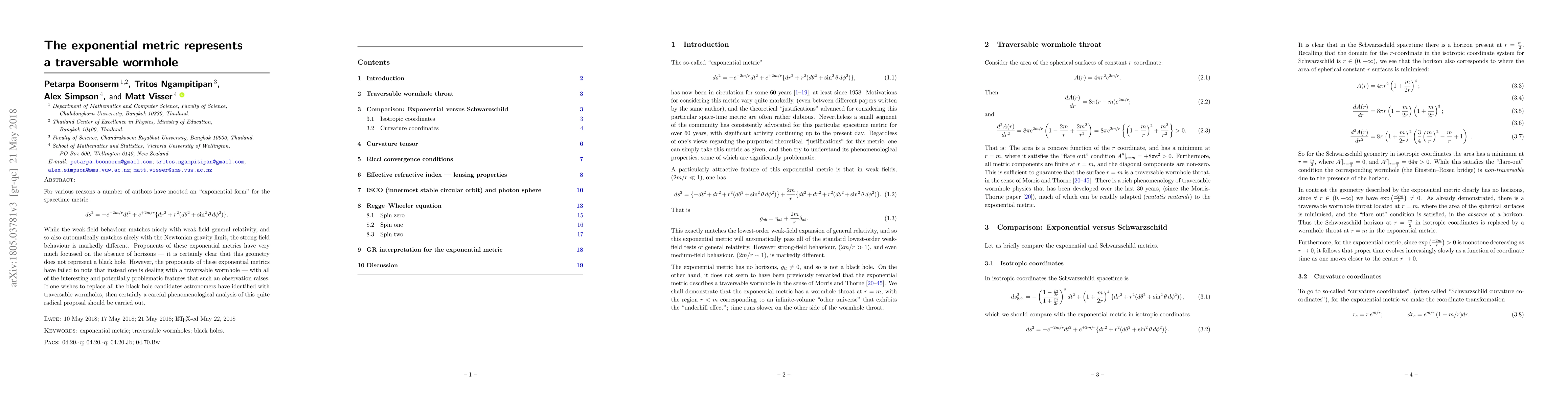 For various reasons a number of authors have mooted an "exponential form" for the spacetime metric: \[ ds^2 = - e^{-2m/r} dt^2 + e^{+2m/r}\{dr^2 + r^2(d\theta^2+\sin^2\theta \, d\phi^2)\}. \] While the weak-field behaviour matches nicely with weak-field general relativity, and so also automatically matches nicely with the Newtonian gravity limit, the strong-field behaviour is markedly different. Proponents of these exponential metrics have very much focussed on the absence of horizons --- it is certainly clear that this geometry does not represent a black hole. However, the proponents of these exponential metrics have failed to note that instead one is dealing with a traversable wormhole --- with all of the interesting and potentially problematic features that such an observation raises. If one wishes to replace all the black hole candidates astronomers have identified with traversable wormholes, then certainly a careful phenomenological analysis of this quite radical proposal should be carried out.