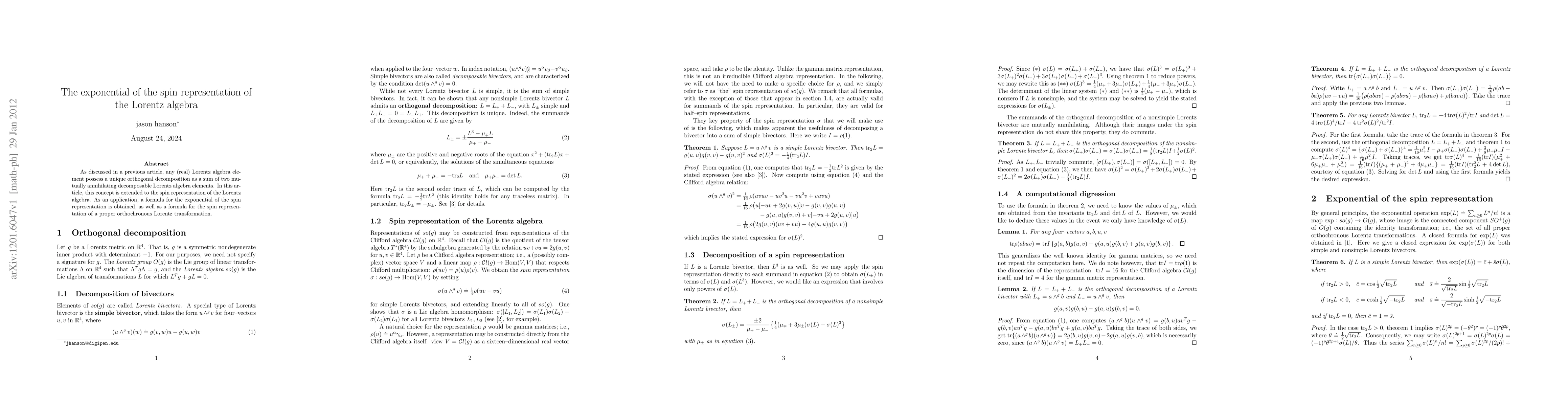 The paper extends the concept of unique orthogonal decomposition to the spin representation of the Lorentz algebra, providing a formula for its exponential and spin representation of proper orthochronous transformations.