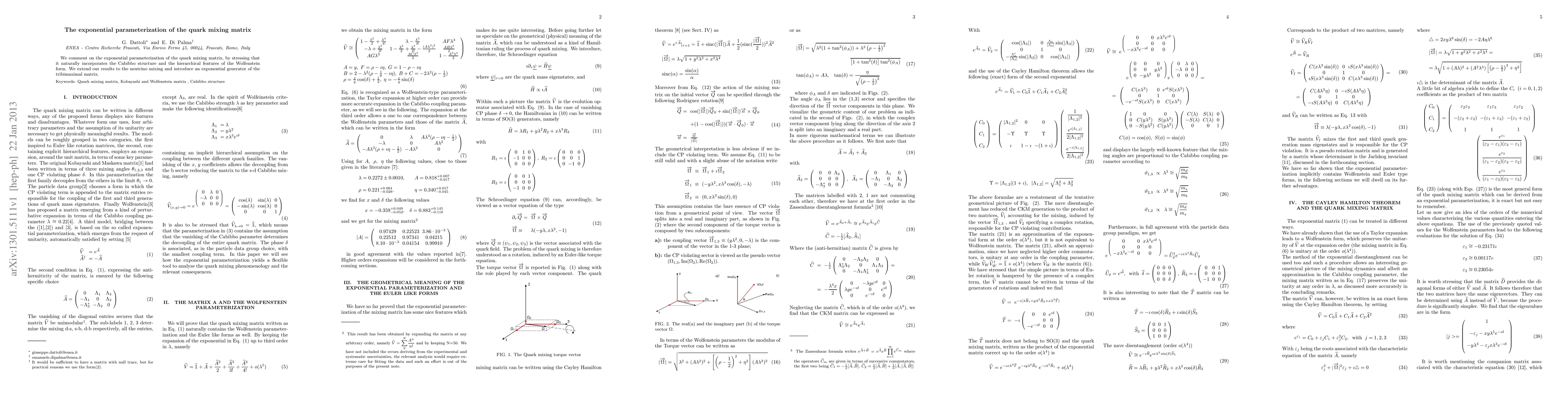 We comment on the exponential parameterization of the quark mixing matrix, by stressing that it naturally incorporates the Cabibbo structure and the hierarchical features of the Wolfenstein form. We extend our results to the neutrino mixing and introduce an exponential generator of the tribimaximal matrix.