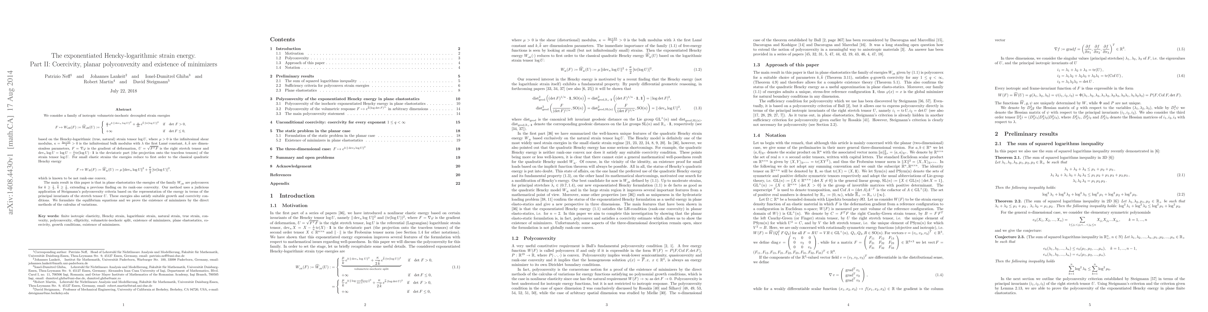 This paper investigates the exponentiated Hencky-logarithmic strain energy, demonstrating its polyconvexity and coercivity in planar elastostatics for specific parameters. It proves the existence of minimizers for these energies using variational methods, extending previous findings on rank-one convexity.
