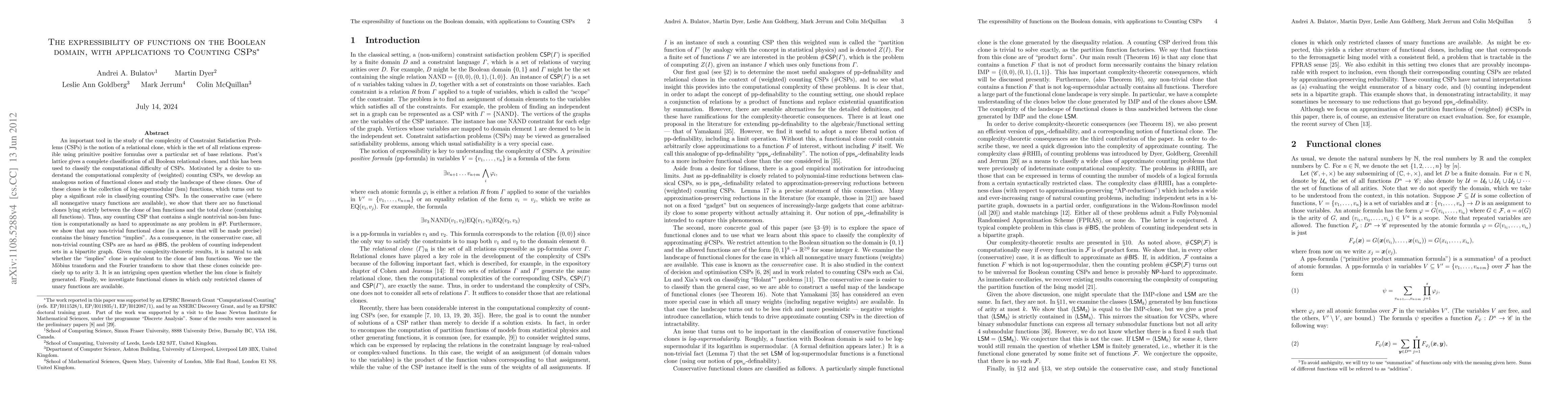This paper classifies Boolean functional clones and their role in counting CSPs, showing that log-supermodular functions are crucial for complexity classification. It demonstrates that any non-trivial clone in the conservative case includes the "implies" function, leading to the equivalence of the "implies" clone and the lsm clone up to arity 3, and raises the question of whether the lsm clone is finitely generated.
