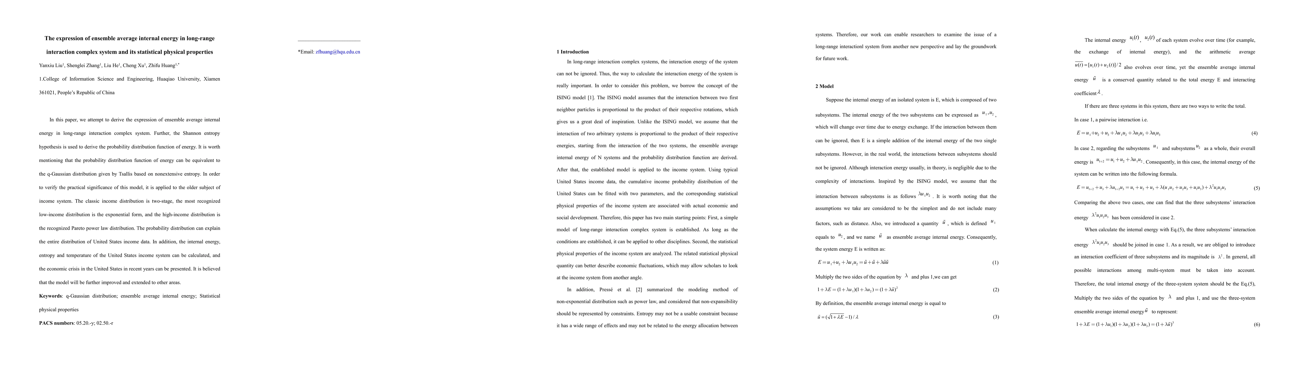 In this paper, we attempt to derive the expression of ensemble average internal energy in long-range interaction complex system. Further, the Shannon entropy hypothesis is used to derive the probability distribution function of energy. It is worth mentioning that the probability distribution function of energy can be equivalent to the q-Gaussian distribution given by Tsallis based on nonextensive entropy. In order to verify the practical significance of this model, it is applied to the older subject of income system. The classic income distribution is two-stage, the most recognized low-income distribution is the exponential form, and the high-income distribution is the recognized Pareto power law distribution. The probability distribution can explain the entire distribution of United States income data. In addition, the internal energy, entropy and temperature of the United States income system can be calculated, and the economic crisis in the United States in recent years can be presented. It is believed that the model will be further improved and extended to other areas.
