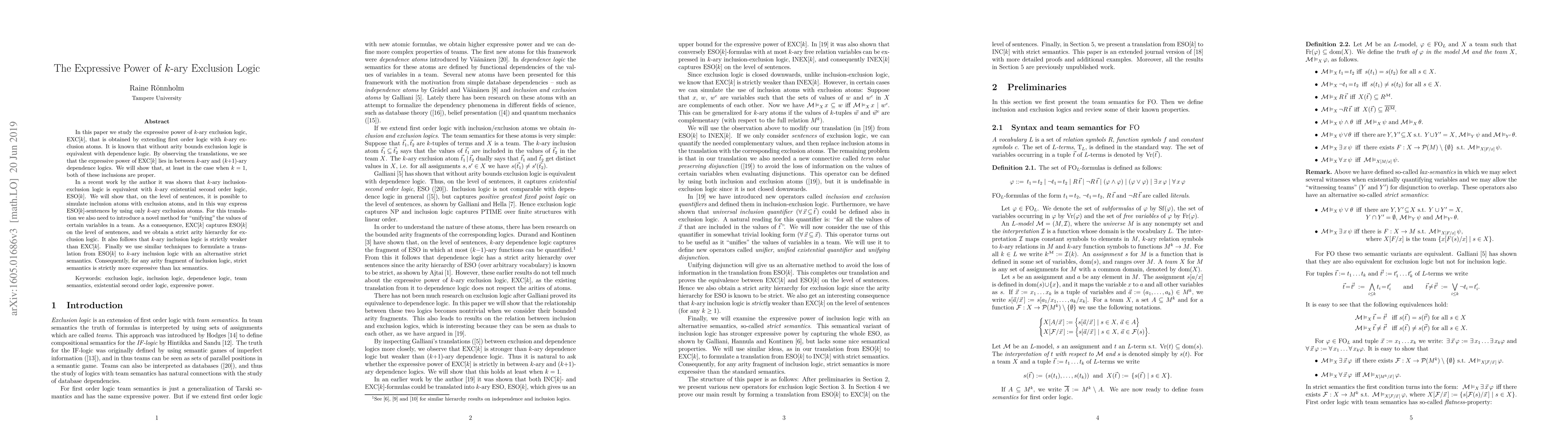 This paper explores the expressive power of k-ary exclusion logic (EXC[k]), demonstrating that it lies between k-ary and (k+1)-ary dependence logics. It shows that EXC[k] can simulate k-ary existential second order logic (ESO[k]) using k-ary exclusion atoms, establishing a strict arity hierarchy for exclusion logic and proving that k-ary inclusion logic is strictly weaker than EXC[k].