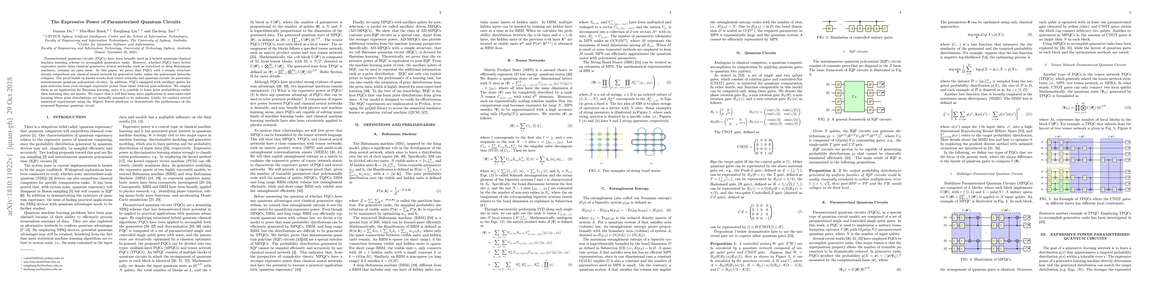 Parameterized quantum circuits (PQCs) have been broadly used as a hybrid quantum-classical machine learning scheme to accomplish generative tasks. However, whether PQCs have better expressive power than classical generative neural networks, such as restricted or deep Boltzmann machines, remains an open issue. In this paper, we prove that PQCs with a simple structure already outperform any classical neural network for generative tasks, unless the polynomial hierarchy collapses. Our proof builds on known results from tensor networks and quantum circuits (in particular, instantaneous quantum polynomial circuits). In addition, PQCs equipped with ancillary qubits for post-selection have even stronger expressive power than those without post-selection. We employ them as an application for Bayesian learning, since it is possible to learn prior probabilities rather than assuming they are known. We expect that it will find many more applications in semi-supervised learning where prior distributions are normally assumed to be unknown. Lastly, we conduct several numerical experiments using the Rigetti Forest platform to demonstrate the performance of the proposed Bayesian quantum circuit.