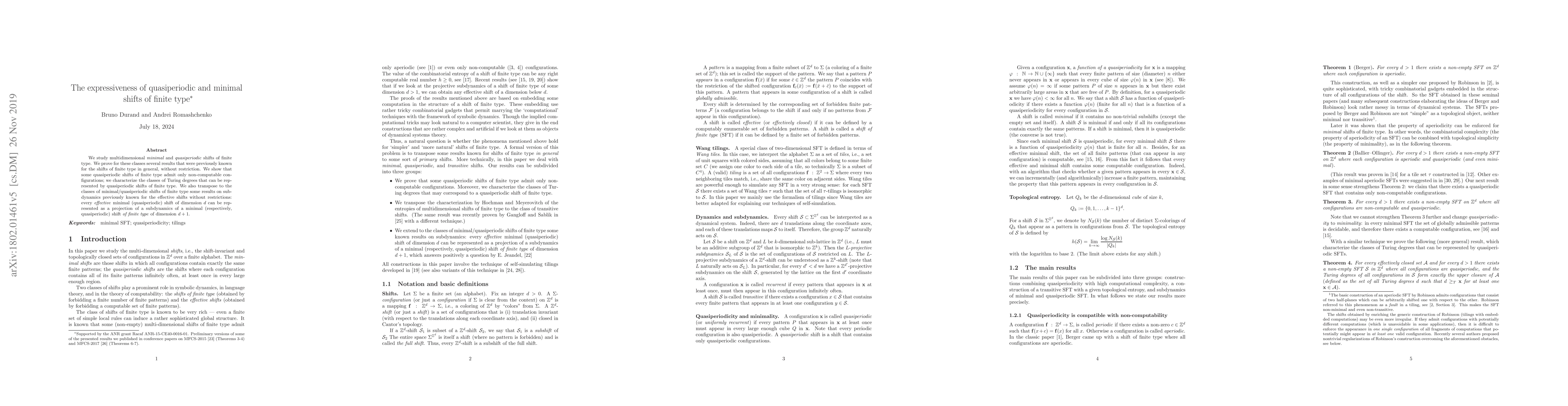 We study multidimensional minimal and quasiperiodic shifts of finite type. We prove for these classes several results that were previously known for the shifts of finite type in general, without restriction. We show that some quasiperiodic shifts of finite type admit only non-computable configurations; we characterize the classes of Turing degrees that can be represented by quasiperiodic shifts of finite type. We also transpose to the classes of minimal/quasiperiodic shifts of finite type some results on subdynamics previously known for the effective shifts without restrictions: every effective minimal (quasiperiodic) shift of dimension $d$ can be represented as a projection of a subdynamics of a minimal (respectively, quasiperiodic) shift of finite type of dimension $d+1$.