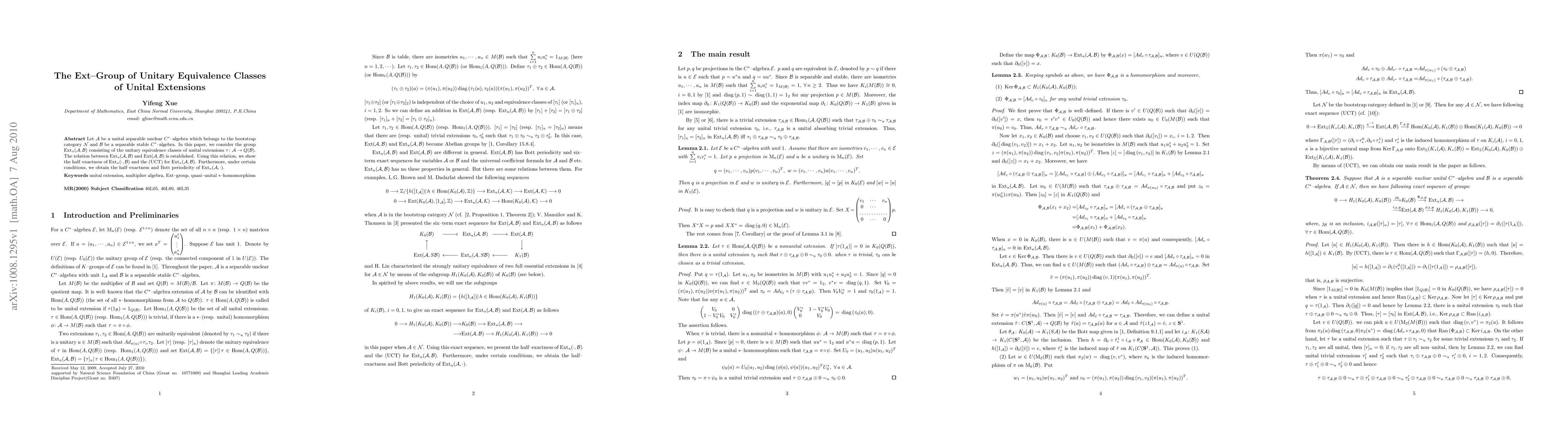 Let $\A$ be a unital separable nuclear $C^*$--algebra which belongs to the bootstrap category $\N$ and $\B$ be a separable stable $C^*$--algebra. In this paper, we consider the group $\Ext_u(\A,\B)$ consisting of the unitary equivalence classes of unital extensions $\tau\colon\A\rightarrow Q(\B)$. The relation between $\Ext_u(\A,\B)$ and $\Ext(\A,\B)$ is established. Using this relation, we show the half--exactness of $\Ext_u(\cdot,\B)$ and the (UCT) for $\Ext_u(\A,\B)$. Furthermore, under certain conditions, we obtain the half--exactness and Bott periodicity of $\Ext_u(\A,\cdot)$.