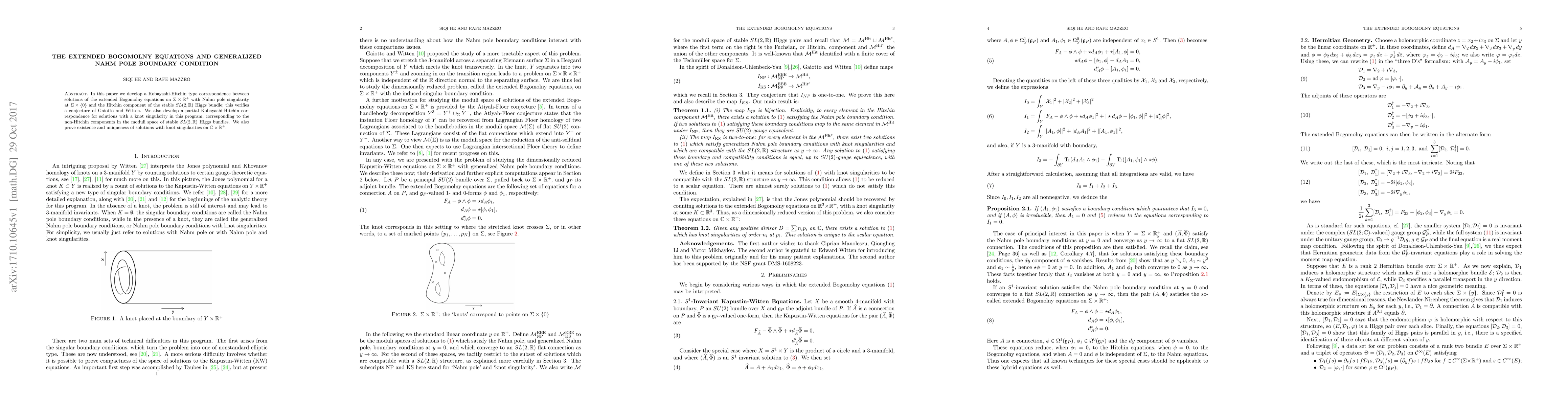 In this paper we develop a Kobayashi-Hitchin type correspondence between solutions of the extended Bogomolny equations on $\Sigma\times \RP$ with Nahm pole singularity at $\Sigma \times \{0\}$ and the Hitchin component of the stable $SL(2,\mathbb{R})$ Higgs bundle; this verifies a conjecture of Gaiotto and Witten. We also develop a partial Kobayashi-Hitchin correspondence for solutions with a knot singularity in this program, corresponding to the non-Hitchin components in the moduli space of stable $SL(2,\mathbb{R})$ Higgs bundles. We also prove existence and uniqueness of solutions with knot singularities on $\mathbb{C}\ti\RP$.