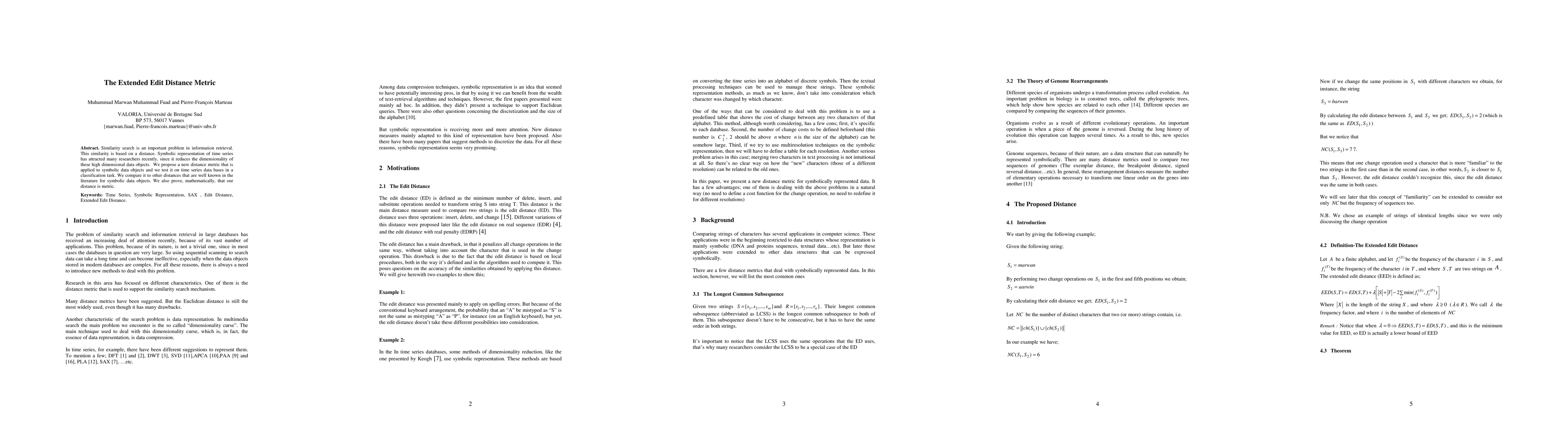 Similarity search is an important problem in information retrieval. This similarity is based on a distance. Symbolic representation of time series has attracted many researchers recently, since it reduces the dimensionality of these high dimensional data objects. We propose a new distance metric that is applied to symbolic data objects and we test it on time series data bases in a classification task. We compare it to other distances that are well known in the literature for symbolic data objects. We also prove, mathematically, that our distance is metric.