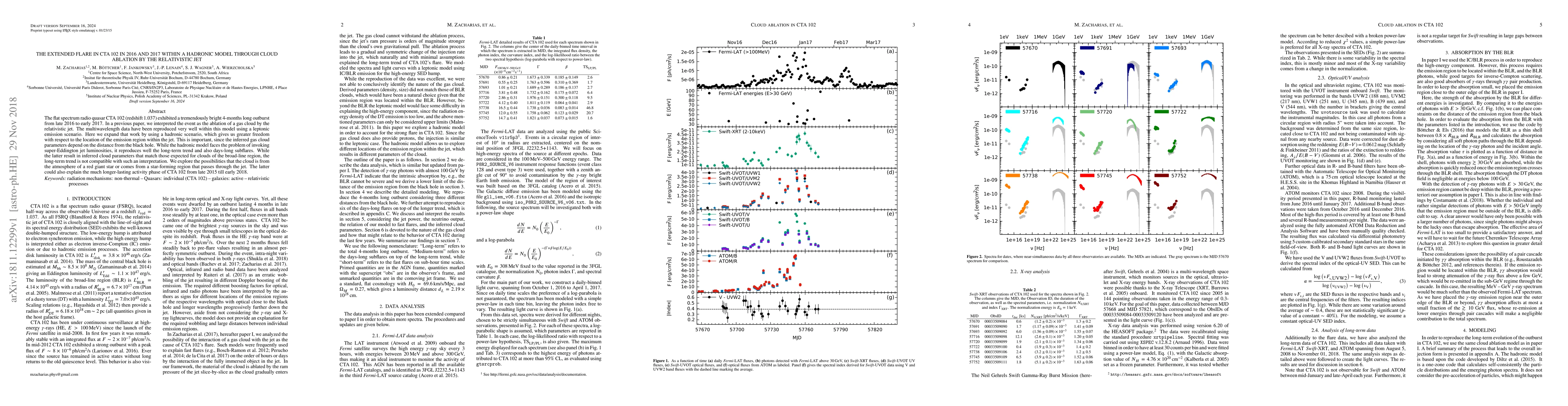 The paper investigates the extended flare in CTA 102 using a hadronic model where a relativistic jet ablates a gas cloud, explaining the 4-month outburst. While the model fits the long-term trend and subflares, it suggests the gas cloud may originate from a red giant's atmosphere or a star-forming region, rather than the broad-line region.