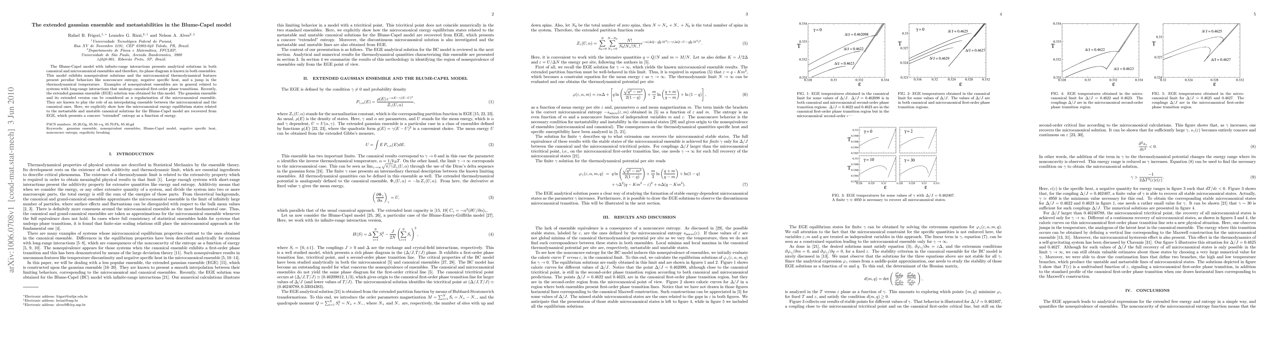 This paper investigates the extended Gaussian ensemble (EGE) solution for the Blume-Capel model, demonstrating its role in recovering microcanonical energy equilibrium states related to metastable and unstable canonical solutions. The EGE presents a concave "extended" entropy, serving as an interpolating ensemble between microcanonical and canonical ensembles.