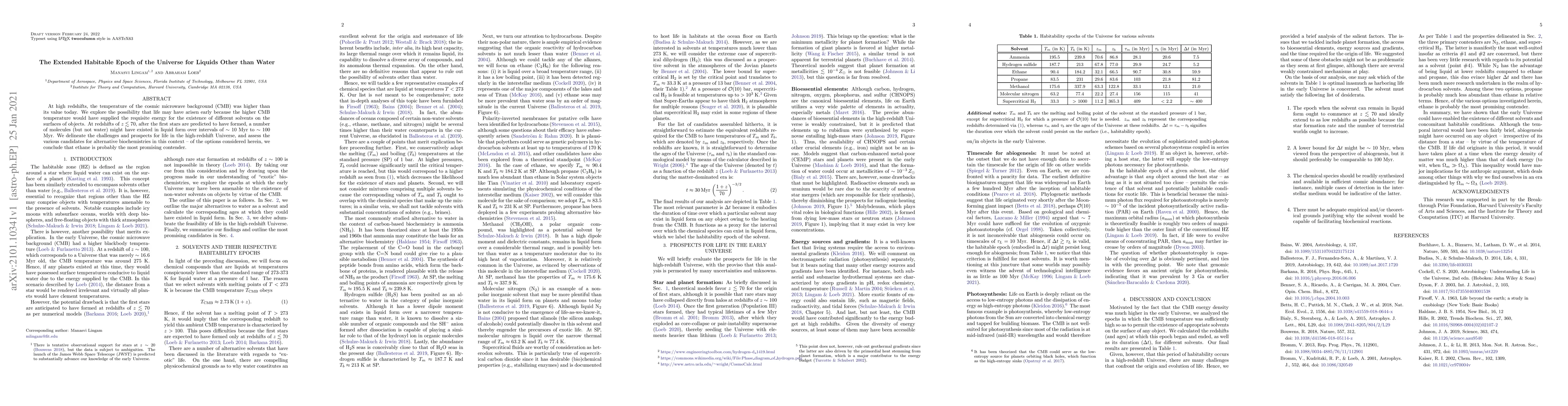 At high redshifts, the temperature of the cosmic microwave background (CMB) was higher than its value today. We explore the possibility that life may have arisen early because the higher CMB temperature would have supplied the requisite energy for the existence of different solvents on the surfaces of objects. At redshifts of $z \lesssim 70$, after the first stars are predicted to have formed, a number of molecules (but not water) might have existed in liquid form over intervals of $\sim 10$ Myr to $\sim 100$ Myr. We delineate the challenges and prospects for life in the high-redshift Universe, and assess the various candidates for alternative biochemistries in this context -- of the options considered herein, we conclude that ethane is probably the most promising contender.