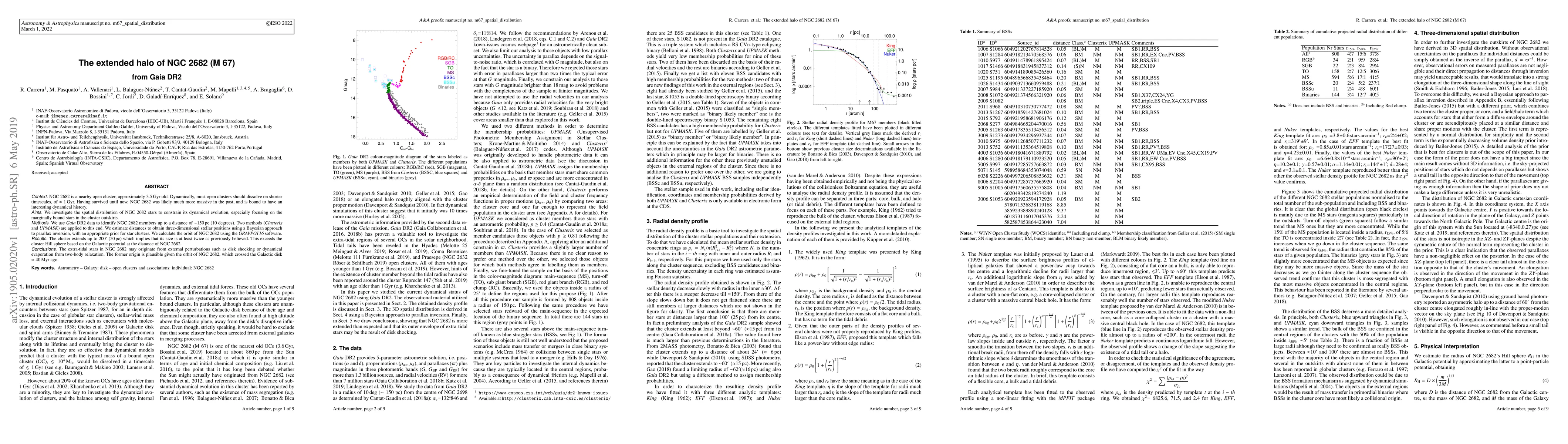 Context: NGC 2682 is a nearby open cluster, approximately 3.5 Gyr old. Dynamically, most open clusters should dissolve on shorter timescales, of ~ 1 Gyr. Having survived until now, NGC 2682 was likely much more massive in the past, and is bound to have an interesting dynamical history. Aims: We investigate the spatial distribution of NGC 2682 stars to constrain its dynamical evolution, especially focusing on the marginally bound stars in the cluster outskirts. Methods: We use Gaia DR2 data to identify NGC 2682 members up to a distance of ~150 pc (10 degrees). Two methods (Clusterix and UPMASK) are applied to this end. We estimate distances to obtain three-dimensional stellar positions using a Bayesian approach to parallax inversion, with an appropriate prior for star clusters. We calculate the orbit of NGC 2682 using the GRAVPOT16 software. Results: The cluster extends up to 200 arcmin (50 pc) which implies that its size is at least twice as previously believed. This exceeds the cluster Hill sphere based on the Galactic potential at the distance of NGC 2682. Conclusions: The extra-tidal stars in NGC 2682 may originate from external perturbations such as disk shocking or dynamical evaporation from two-body relaxation. The former origin is plausible given the orbit of NGC 2682, which crossed the Galactic disk ~40 Myr ago.