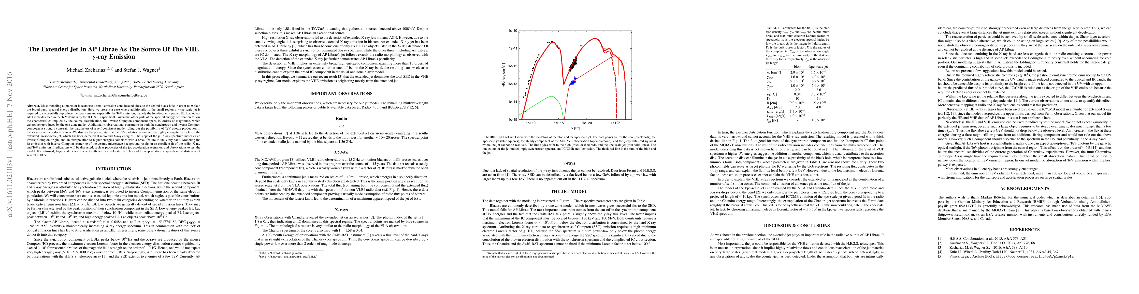 This paper argues that the extended jet in the blazar AP Librae, rather than a small region near the black hole, is the source of its very high-energy (VHE) gamma-ray emission. Modeling indicates that the large-scale jet can reproduce the observed spectrum and TeV emission, suggesting that the jet's inverse Compton scattering of the cosmic microwave background is responsible for the gamma-ray emission.