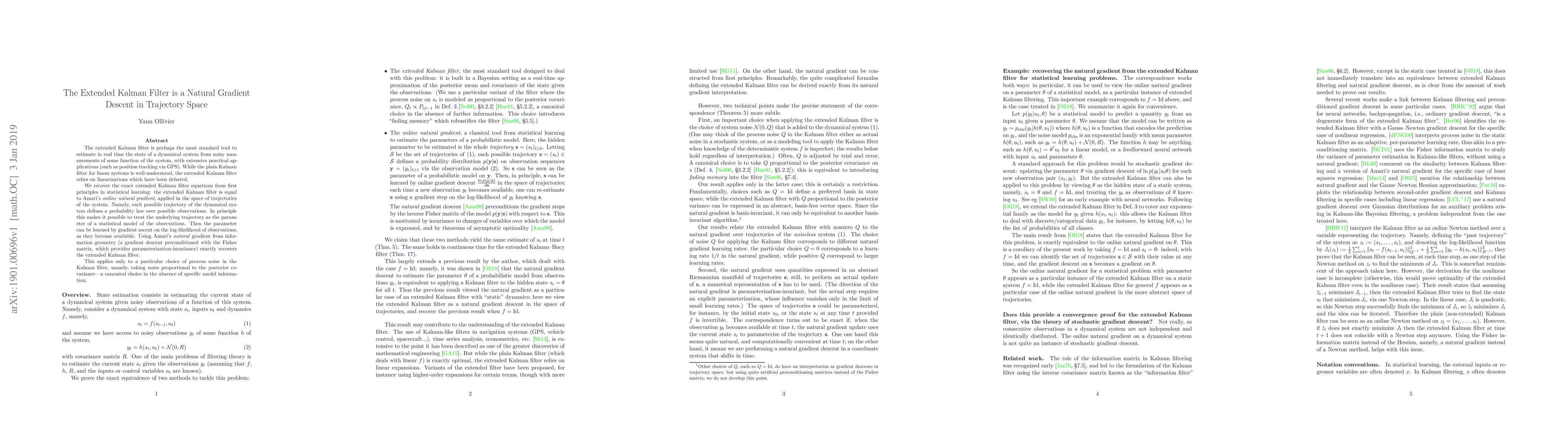 The extended Kalman filter is shown to be equivalent to Amari's online natural gradient descent in the space of system trajectories, providing a statistical learning perspective on its operation. This equivalence is valid under a specific choice of process noise proportional to the posterior covariance.