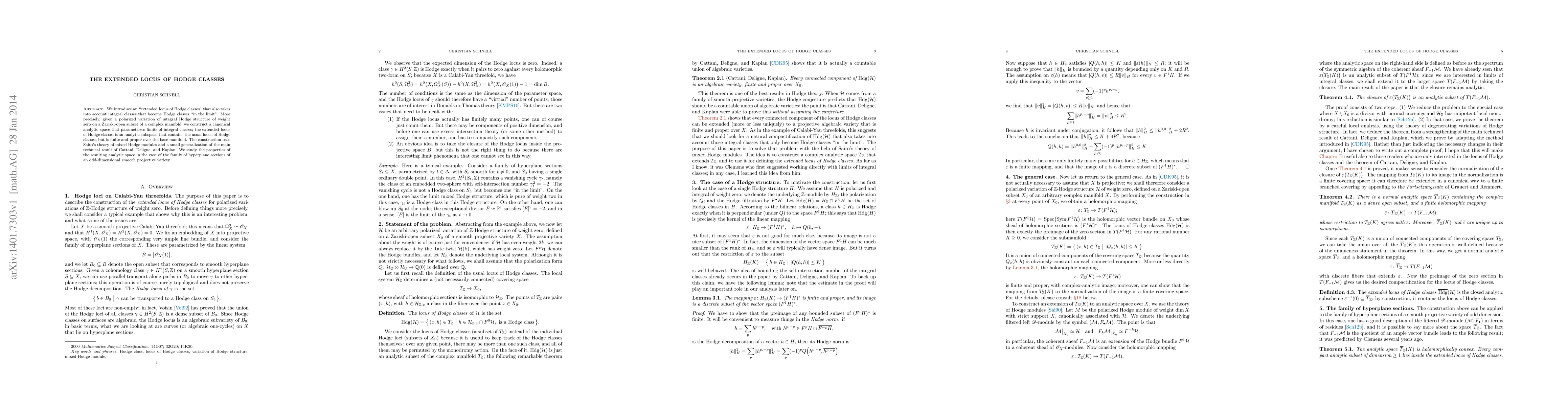 This paper introduces an "extended locus of Hodge classes" that includes integral classes becoming Hodge classes "in the limit," constructed using Saito's mixed Hodge modules and a generalization of Cattani, Deligne, and Kaplan's work. The resulting analytic space, finite and proper over the base manifold, is studied in the context of hyperplane sections of odd-dimensional smooth projective varieties.