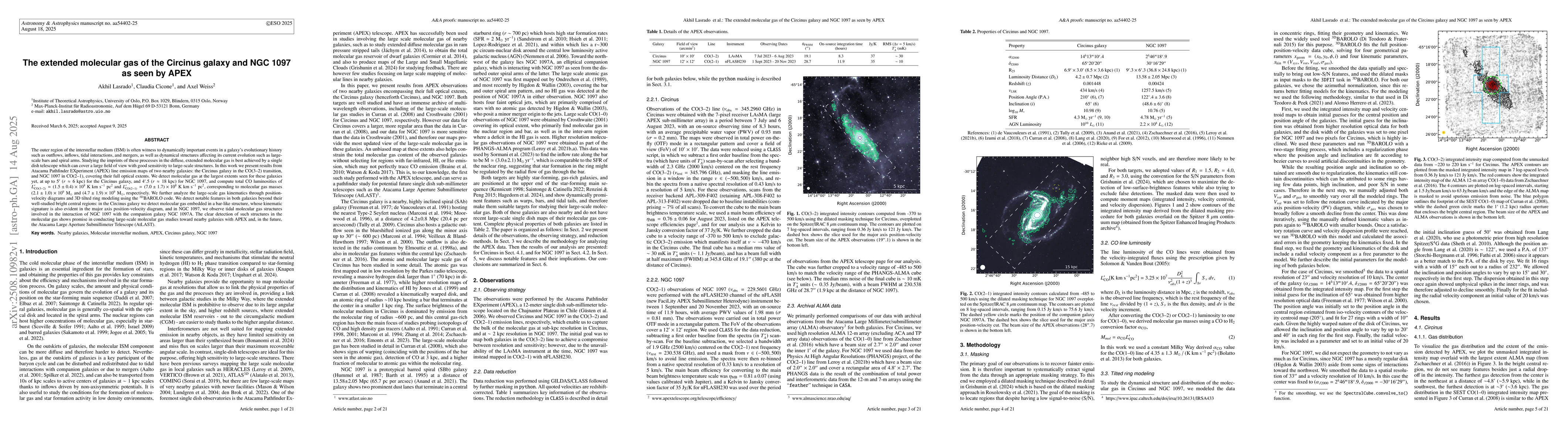 The outer region of the interstellar medium (ISM) is witness to dynamically important events in a galaxy's evolutionary history such as outflows, inflows, tidal interactions, and mergers, as well as dynamical structures affecting its current evolution such as bars and spiral arms. Studying imprints of these processes in the diffuse, extended molecular gas is best achieved by a single dish telescope which can cover a large field of view with good sensitivity to large-scale structures. In this work we present results from APEX line emission maps of two nearby galaxies: the Circinus galaxy in the CO(3-2) transition, and NGC 1097 in CO(2-1), covering their full optical extents. We detect gas at the largest extents seen for these galaxies yet, at 5$^{\prime}$ ($r \approx 6$ kpc) for the Circinus galaxy, and $4^{\prime}.5$ ($r \approx 18$ kpc) for NGC 1097, and compute total CO luminosities of $L^{\prime}_{\mathrm{CO(3-2)}} = (1.5\pm0.4)\times10^{8}$ K km s$^{-1}$ pc$^{2}$ and $L^{\prime}_{\mathrm{CO(2-1)}} = (7.0\pm1.7)\times10^{8}$ K km s$^{-1}$ pc$^{2}$, corresponding to molecular gas masses of $(2.1\pm1.0)\times10^{9}$ M$_{\odot}$ and $(4.7\pm1.9)\times10^{9}$ M$_{\odot}$, respectively. We further analyze the large-scale gas kinematics via PV diagrams and tilted ring modeling using $^{\mathrm{3D}}$BAROLO. We detect notable features in both galaxies beyond the well-studied central regions: in the Circinus galaxy we detect molecular gas embedded in a bar-like structure, whose kinematic signature is also evident in the major axis PV diagram, and in NGC 1097, we observe tidal molecular gas involved in the interaction of NGC 1097 with the companion galaxy NGC 1097A. The clear detection of such molecular gas structures shows promise in conducting large-scale molecular gas studies toward nearby galaxies with APEX and, in the future, the Atacama Large Aperture Submillimeter Telescope (AtLAST).