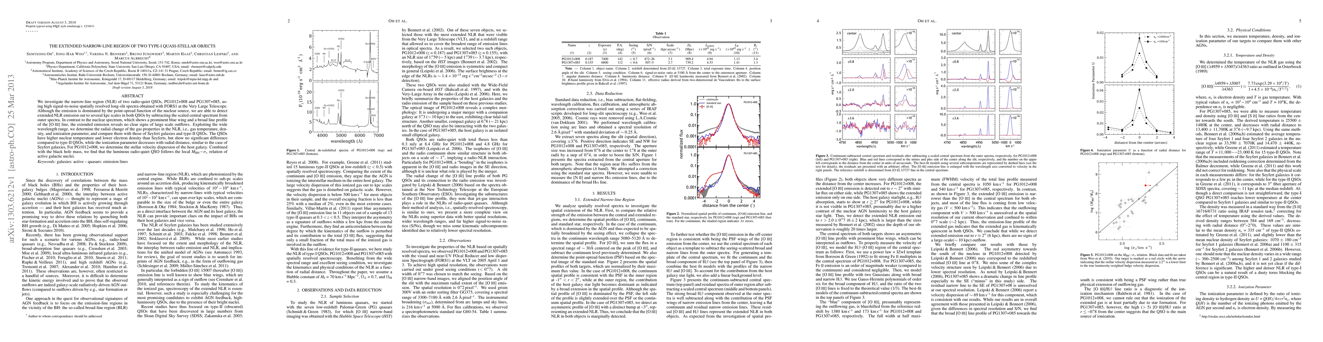 We investigate the narrow-line region (NLR) of two radio-quiet QSOs, PG1012+008 and PG1307+085, using high signal-to-noise spatially resolved long-slit spectra obtained with FORS1 at the Very Large Telescope. Although the emission is dominated by the point-spread function of the nuclear source, we are able to detect extended NLR emission out to several kpc scales in both QSOs by subtracting the scaled central spectrum from outer spectra. In contrast to the nuclear spectrum, which shows a prominent blue wing and a broad line profile of the [O III] line, the extended emission reveals no clear signs of large scale outflows. Exploiting the wide wavelength range, we determine the radial change of the gas properties in the NLR, i.e., gas temperature, density, and ionization parameter, and compare them with those of Seyfert galaxies and type-II QSOs. The QSOs have higher nuclear temperature and lower electron density than Seyferts, but show no significant difference compared to type-II QSOs, while the ionization parameter decreases with radial distance, similar to the case of Seyfert galaxies. For PG1012+008, we determine the stellar velocity dispersion of the host galaxy. Combined with the black hole mass, we find that the luminous radio-quiet QSO follows the local M_BH-sigma* relation of active galactic nuclei.