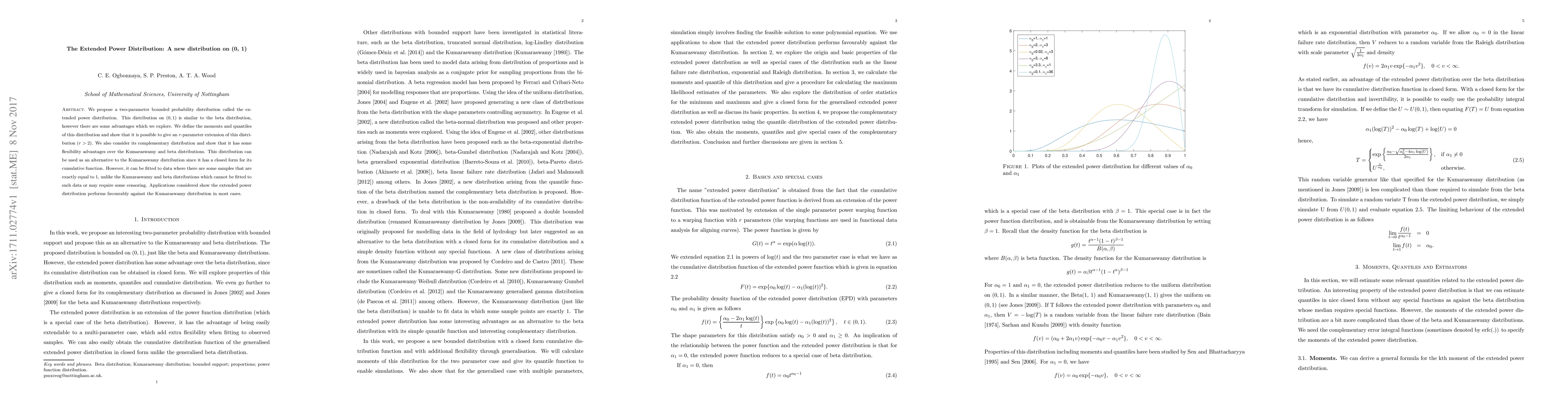 We propose a two-parameter bounded probability distribution called the extended power distribution. This distribution on $(0, 1)$ is similar to the beta distribution, however there are some advantages which we explore. We define the moments and quantiles of this distribution and show that it is possible to give an $r$-parameter extension of this distribution ($r>2$). We also consider its complementary distribution and show that it has some flexibility advantages over the Kumaraswamy and beta distributions. This distribution can be used as an alternative to the Kumaraswamy distribution since it has a closed form for its cumulative function. However, it can be fitted to data where there are some samples that are exactly equal to 1, unlike the Kumaraswamy and beta distributions which cannot be fitted to such data or may require some censoring. Applications considered show the extended power distribution performs favourably against the Kumaraswamy distribution in most cases.