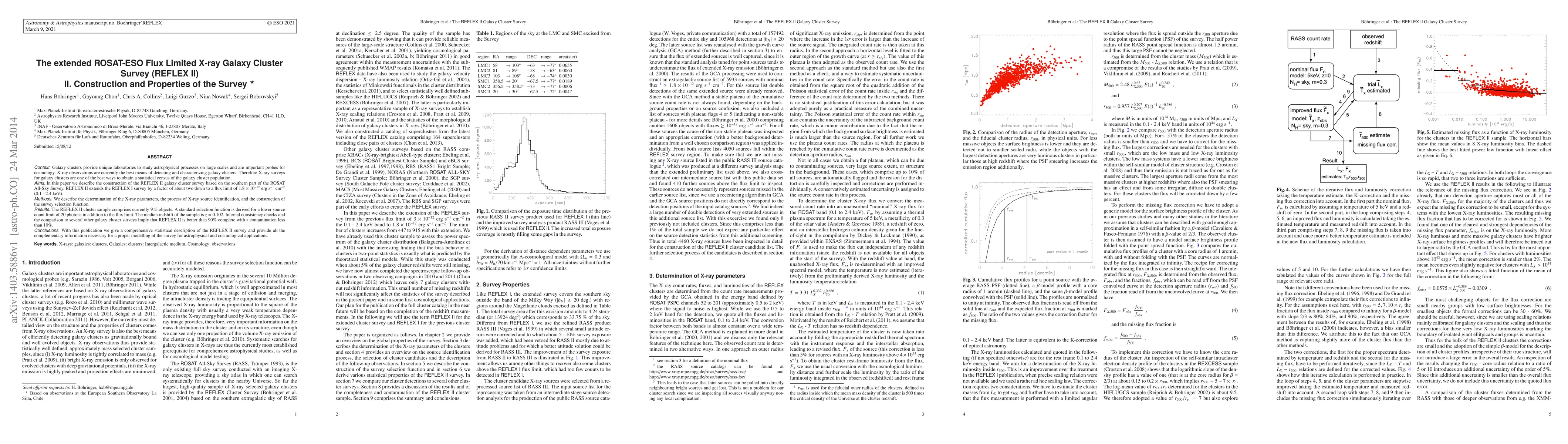 The REFLEX II survey, an extension of the REFLEX I galaxy cluster survey, utilizes the ROSAT All-Sky Survey to detect and characterize galaxy clusters down to a flux limit of $1.8 \times 10^{-12}$ erg s$^{-1}$ cm$^{-2}$. The survey comprises 915 clusters, with a median redshift of $z = 0.102$, and is over 90% complete with less than 10% contamination.
