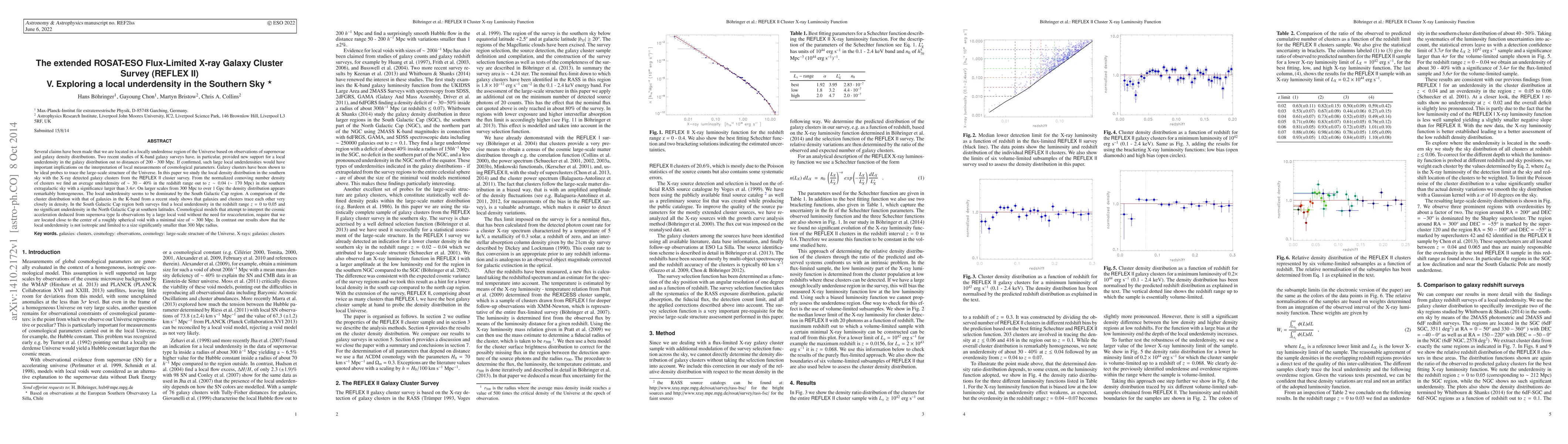 Several claims have been made that we are located in a locally underdense region of the Universe based on observations of supernovae and galaxy density distributions. Two recent studies of K-band galaxy surveys have provided new support for a local underdensity in the galaxy distribution out to distances of 200 - 300 Mpc. If confirmed, such large local underdensities would have important implications on the interpretation of local measurements of cosmological parameters. Galaxy clusters have been shown to be ideal probes to trace the large-scale structure of the Universe. In this paper we study the local density distribution in the southern sky with the X-ray detected galaxy clusters from the REFLEX II cluster survey. From the normalized comoving number density of clusters we find an average underdensity of ~30 - 40% in the redshift range out to z ~0.04 (~170 Mpc) in the southern extragalactic sky with a significance larger than 3.4sigma. On larger scales from 300 Mpc to over 1 Gpc the density distribution appears remarkably homogeneous. The local underdensity seems to be dominated by the South Galactic Cap region. A comparison of the cluster distribution with that of galaxies in the K-band from a recent study shows that galaxies and clusters trace each other very closely in density. In the South Galactic Cap region both surveys find a local underdensity in the redshift range z= 0 to 0.05 and no significant underdensity in the North Galactic Cap at southern latitudes. Our results to not support cosmological models that attempt to interpret the cosmic acceleration by a large local void, since the local underdensity we find is not isotropic and limited to a size significantly smaller than 300 Mpc radius.