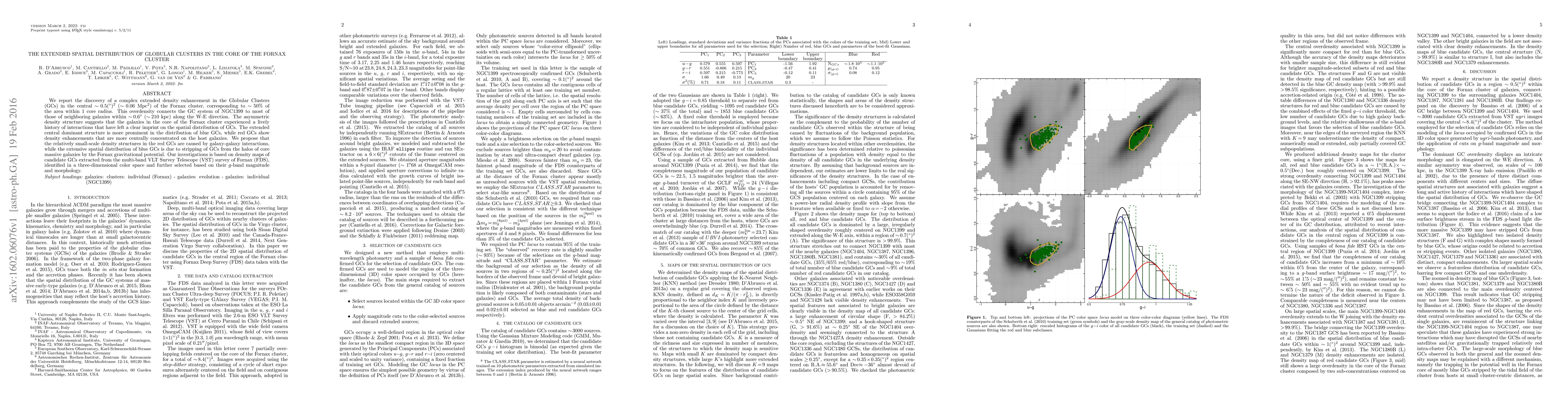 This study reveals an extended density enhancement of globular clusters in the core of the Fornax cluster, linking the GC system of NGC1399 to neighboring galaxies, suggesting a history of galaxy interactions. The blue GCs exhibit a more extensive spatial distribution due to stripping by the gravitational potential, while red GCs show more centrally concentrated density enhancements likely caused by galaxy-galaxy interactions.