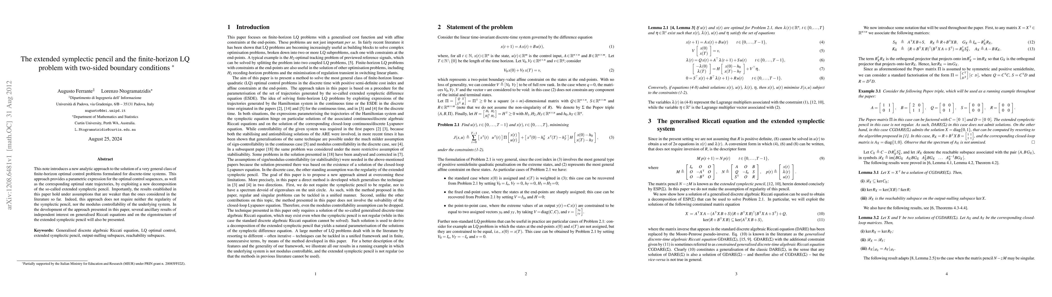 This note introduces a new analytic approach to the solution of a very general class of finite-horizon optimal control problems formulated for discrete-time systems. This approach provides a parametric expression for the optimal control sequences, as well as the corresponding optimal state trajectories, by exploiting a new decomposition of the so-called extended symplectic pencil. Importantly, the results established in this paper hold under assumptions that are weaker than the ones considered in the literature so far. Indeed, this approach does not require neither the regularity of the symplectic pencil, nor the modulus controllability of the underlying system. In the development of the approach presented in this paper, several ancillary results of independent interest on generalised Riccati equations and on the eigenstructure of the extended symplectic pencil will also be presented.