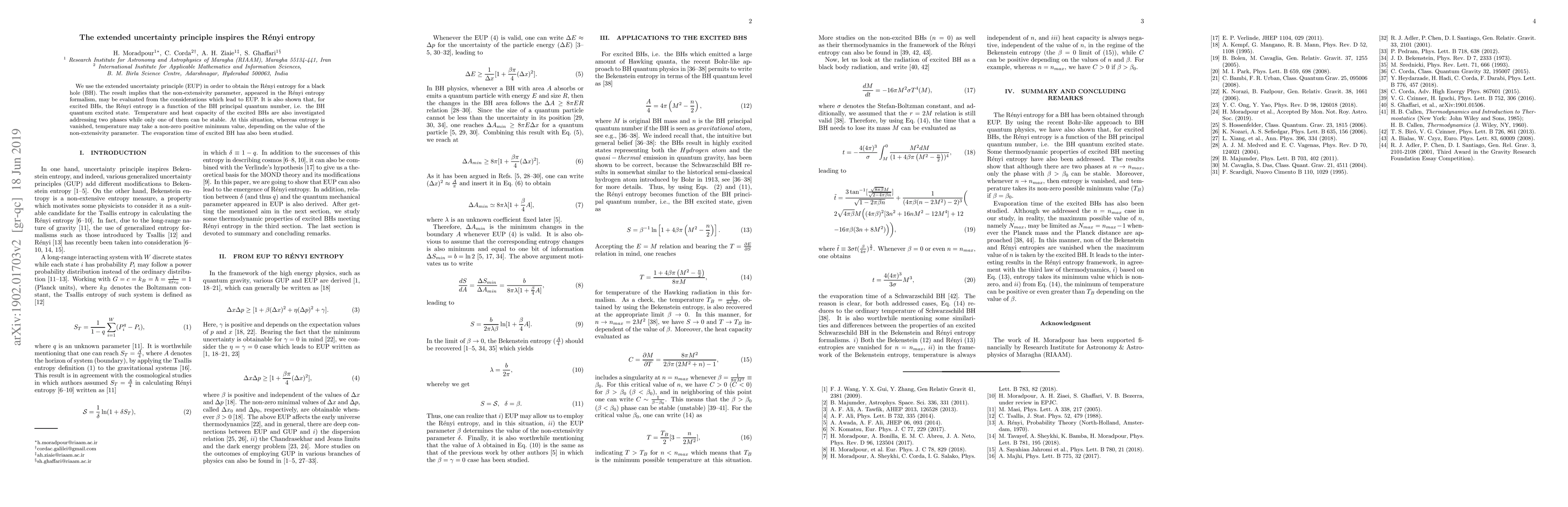 The research employs the extended uncertainty principle (EUP) to derive the Rényi entropy for a black hole, demonstrating that the non-extensivity parameter in the Rényi entropy formalism can be evaluated from EUP considerations. The study also investigates thermodynamic properties of excited black holes, including temperature, heat capacity, and evaporation time.