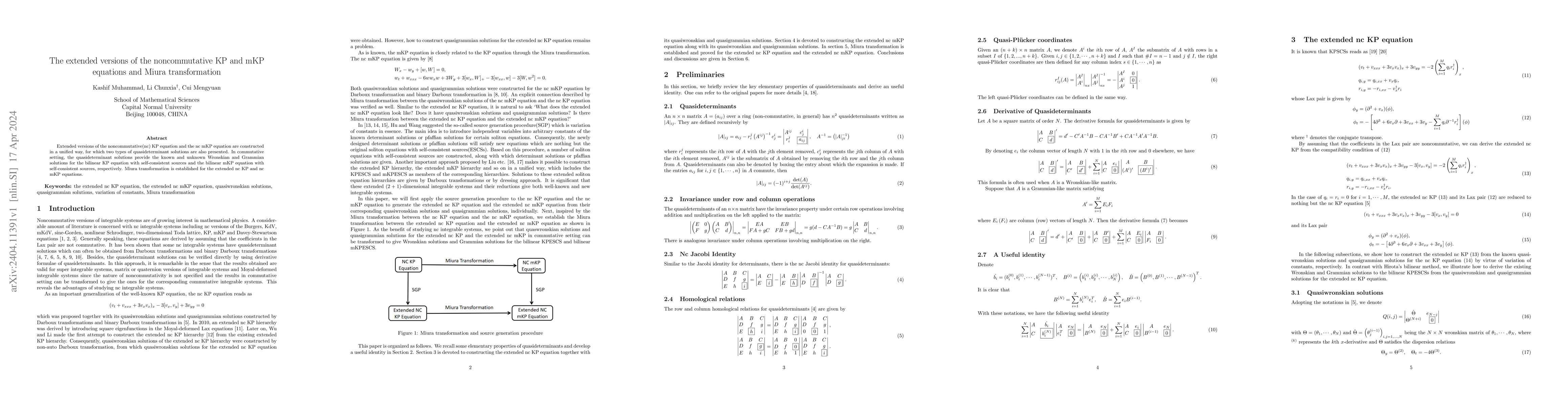 Summary: This paper constructs extended versions of noncommutative KP and mKP equations, presenting quasideterminant solutions in a unified manner. It also establishes Miura transformation for these equations and relates quasideterminant solutions to known Wronskian and Grammian solutions in commutative settings.