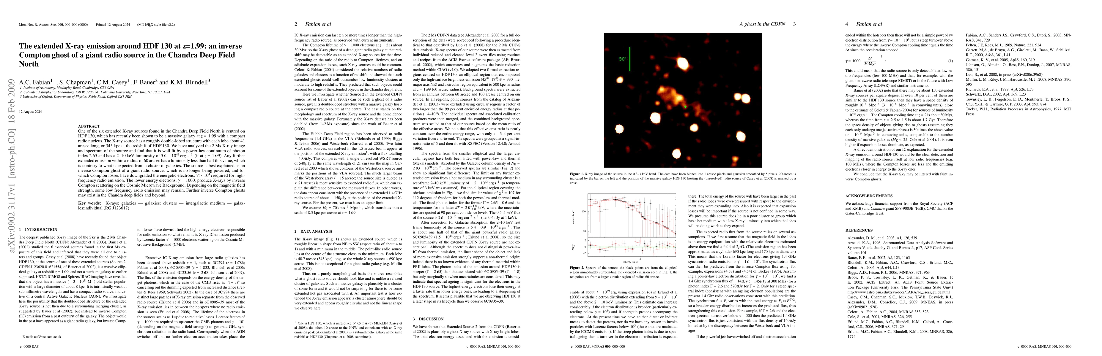 This paper investigates an extended X-ray emission around HDF130 at z=1.99, revealing a double-lobed structure indicative of an inverse Compton ghost of a giant radio source. The X-ray source is best explained by downgraded energetic electrons scattering Cosmic Microwave Background photons, producing X-rays, with no significant extended emission expected from a galaxy cluster.