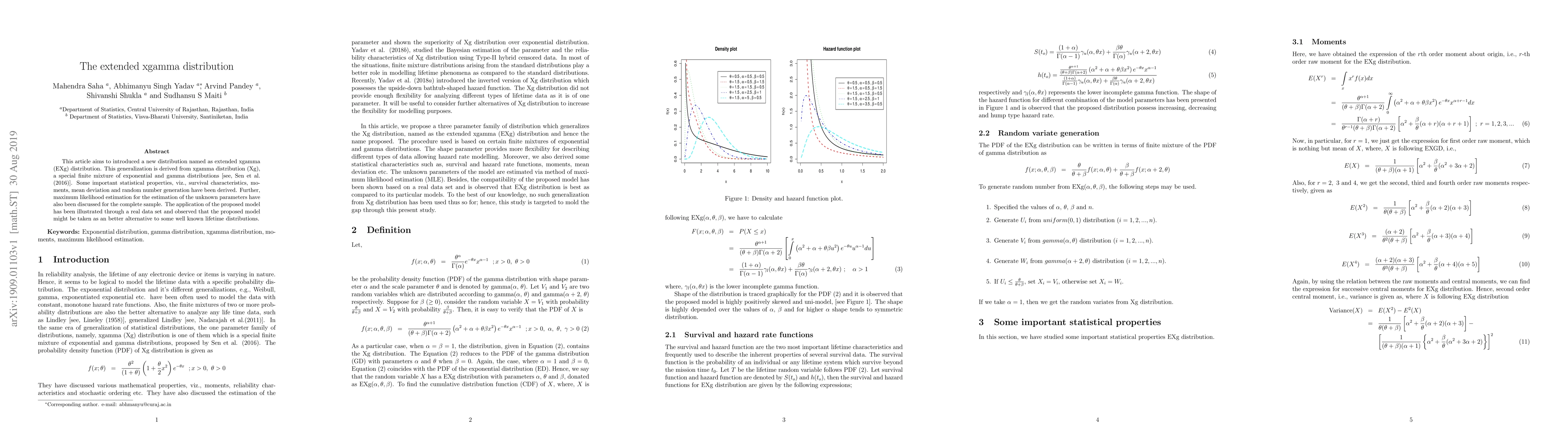 This article aims to introduced a new distribution named as extended xgamma (EXg) distribution. This generalization is derived from xgamma distribution (Xg), a special finite mixture of exponential and gamma distributions [see, Sen et al. ($2016$)]. Some important statistical properties, viz., survival characteristics, moments, mean deviation and random number generation have been derived. Further, maximum likelihood estimation for the estimation of the unknown parameters have also been discussed for the complete sample. The application of the proposed model has been illustrated through a real data set and observed that the proposed model might be taken as an better alternative to some well known lifetime distributions.