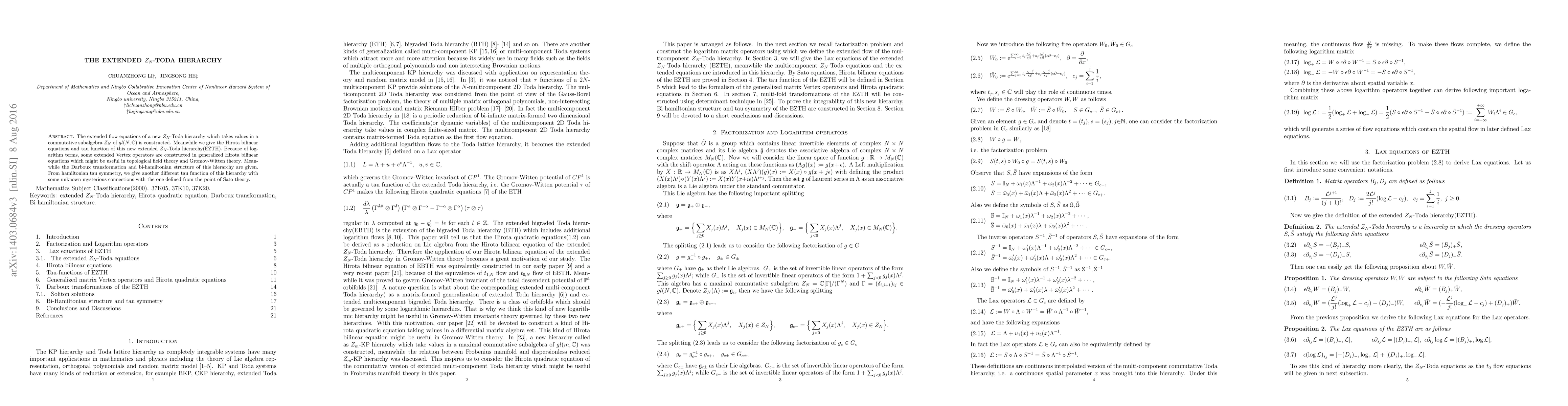 This paper constructs the extended $Z_N$-Toda hierarchy with new flow equations, Hirota bilinear equations, and tau functions. It also introduces extended Vertex operators for potential use in topological field theory and explores its Darboux transformation and bi-hamiltonian structure.