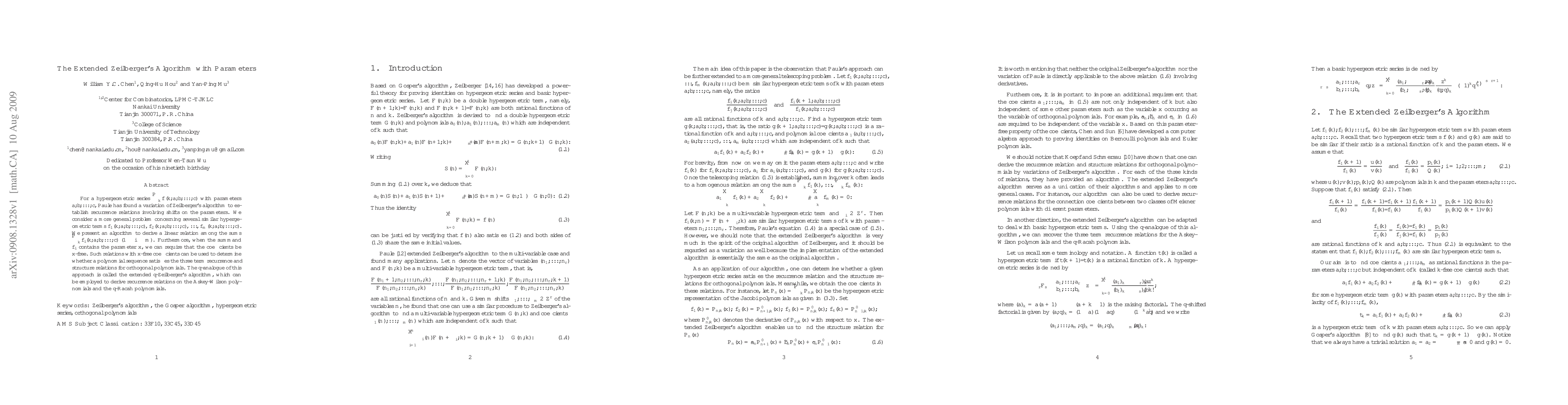 For a hypergeometric series $\sum_k f(k,a, b, ...,c)$ with parameters $a, b, >...,c$, Paule has found a variation of Zeilberger's algorithm to establish recurrence relations involving shifts on the parameters. We consider a more general problem concerning several similar hypergeometric terms $f_1(k, a, b,..., c)$, $f_2(k, a,b, ..., c)$, $...$, $f_m(k, a, b, ..., c)$. We present an algorithm to derive a linear relation among the sums $\sum_k f_i(k,a,b,...,c)$ $(1\leq i \leq m)$. Furthermore, when the summand $f_i$ contains the parameter $x$, we can require that the coefficients be $x$-free. Such relations with $x$-free coefficients can be used to determine whether a polynomial sequence satisfies the three term recurrence and structure relations for orthogonal polynomials. The $q$-analogue of this approach is called the extended $q$-Zeilberger's algorithm, which can be employed to derive recurrence relations on the Askey-Wilson polynomials and the $q$-Racah polynomials.