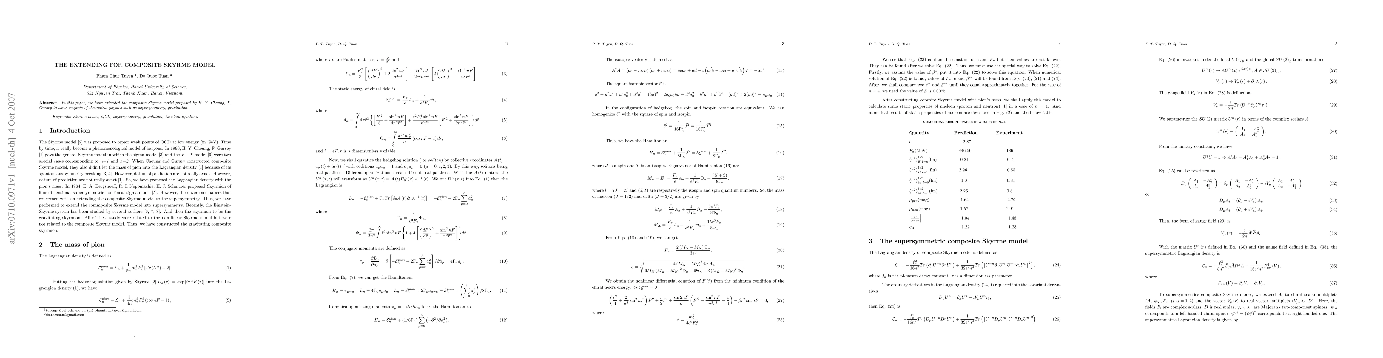 This paper extends the composite Skyrme model to incorporate aspects of supersymmetry and gravitation, building on the foundational work of H. Y. Cheung and F. Gursey. The study aims to integrate these advanced theoretical physics concepts into a broader framework.