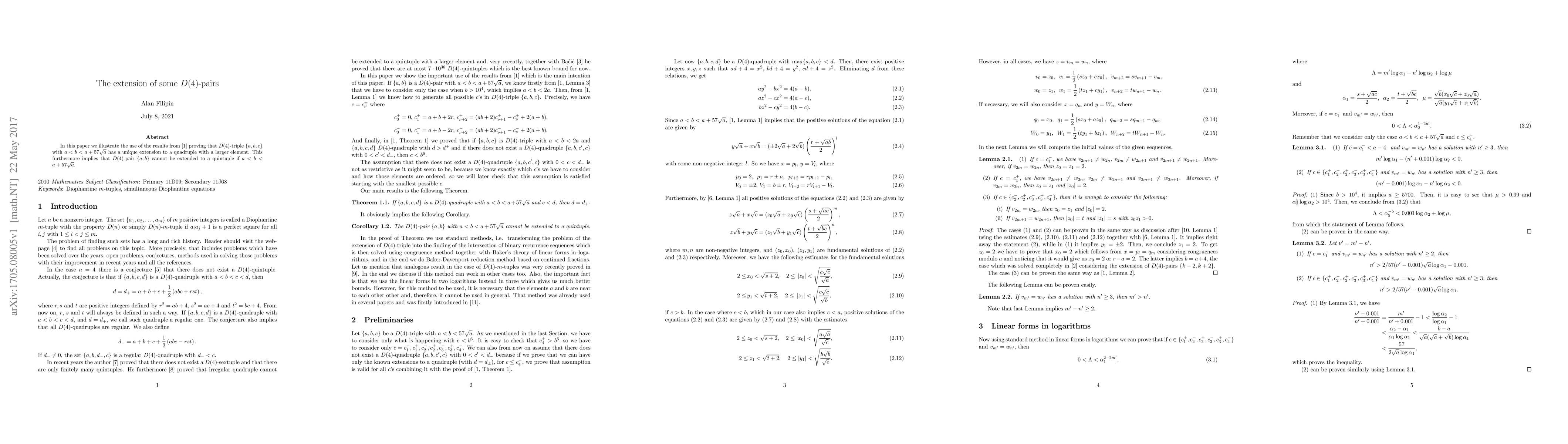 A research paper proves that certain D(4)-pairs cannot be extended to a larger quadruple under specific conditions, providing insight into the limitations of such extensions.