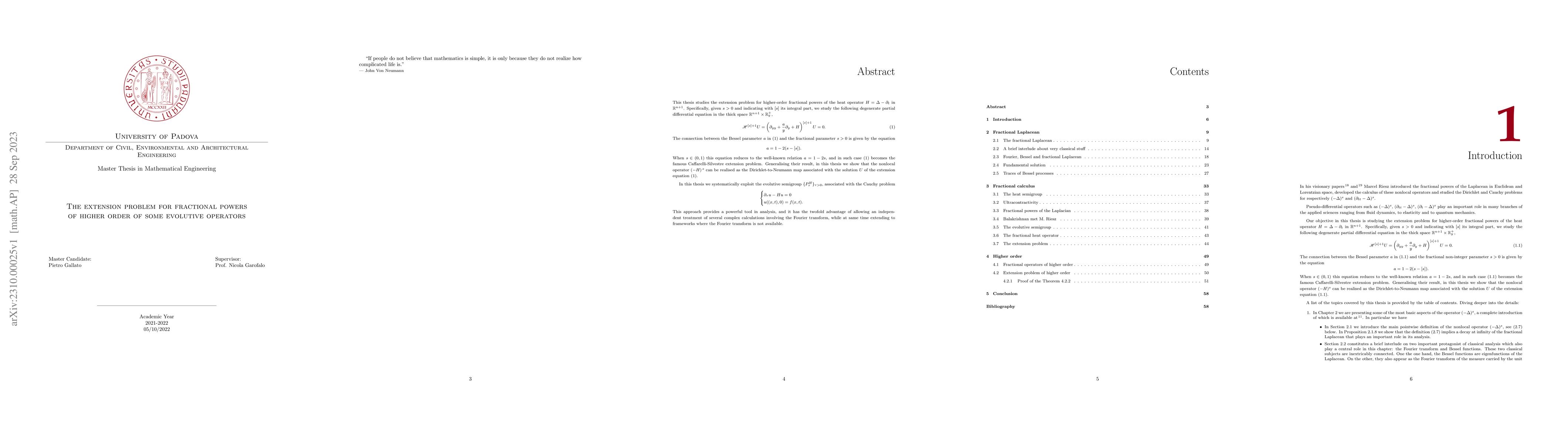 This thesis studies the extension problem for higher-order fractional powers of the heat operator $H=\Delta-\partial_t$ in $\mathbb{R}^{n+1}$. Specifically, given $s>0$ and indicating with $[s]$ its integral part, we study the following degenerate partial differential equation in the thick space $\mathbb{R}^{n+1}\times \mathbb{R}_y^+$, \begin{equation} \label{a:1} \mathscr{H}^{[s]+1}U= \left( \partial_{yy} +\frac{a}{y}\partial_y +H \right)^{[s]+1}U=0. \quad \quad (1) \end{equation} The connection between the Bessel parameter $a$ in (1) and the fractional parameter $s>0$ is given by the equation \begin{equation*} a= 1-2(s-[s]). \end{equation*} When $s\in(0,1)$ this equation reduces to the well-known relation $a=1-2s$, and in such case (1) becomes the famous Caffarelli-Silvestre extension problem. Generalising their result, in this thesis we show that the nonlocal operator $(-H)^{\,s}$ can be realised as the Dirichlet-to-Neumann map associated with the solution $U$ of the extension equation (1). In this thesis we systematically exploit the evolutive semigroup $\{P_{\tau}^H \}_{\tau>0}$, associated with the Cauchy problem \begin{equation*} \begin{cases} \partial_{\tau}u-Hu=0 u((x,t),0)=f(x,t). \end{cases} \end{equation*} This approach provides a powerful tool in analysis, and it has the twofold advantage of allowing an independent treatment of several complex calculations involving the Fourier transform, while at same time extending to frameworks where the Fourier transform is not available.