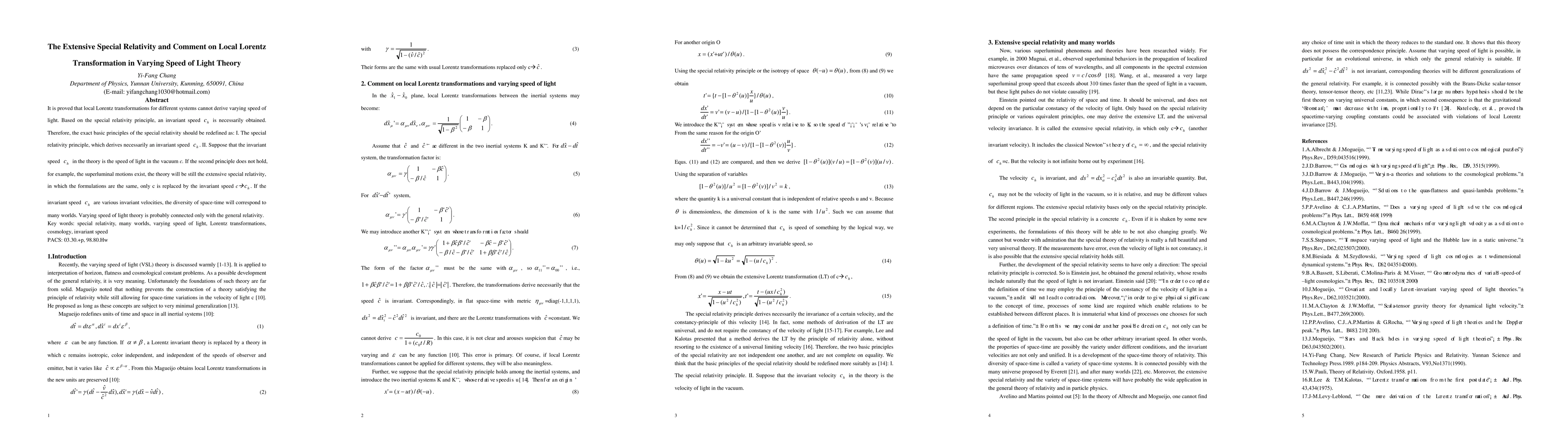 It is proved that local Lorentz transformations for different systems cannot derive varying speed of light. Based on the special relativity principle, an invariant speed is necessarily obtained. Therefore, the exact basic principles of the special relativity should be redefined as: I. The special relativity principle, which derives necessarily an invariant speed. II. Suppose that the invariant speed in the theory is the speed of light in the vacuum c. If the second principle does not hold, for example, the superluminal motions exist, the theory will be still the extensive special relativity, in which the formulations are the same, only c is replaced by the invariant speed. If the invariant speed are various invariant velocities, the diversity of space-time will correspond to many worlds. Varying speed of light theory is probably connected only with the general relativity.