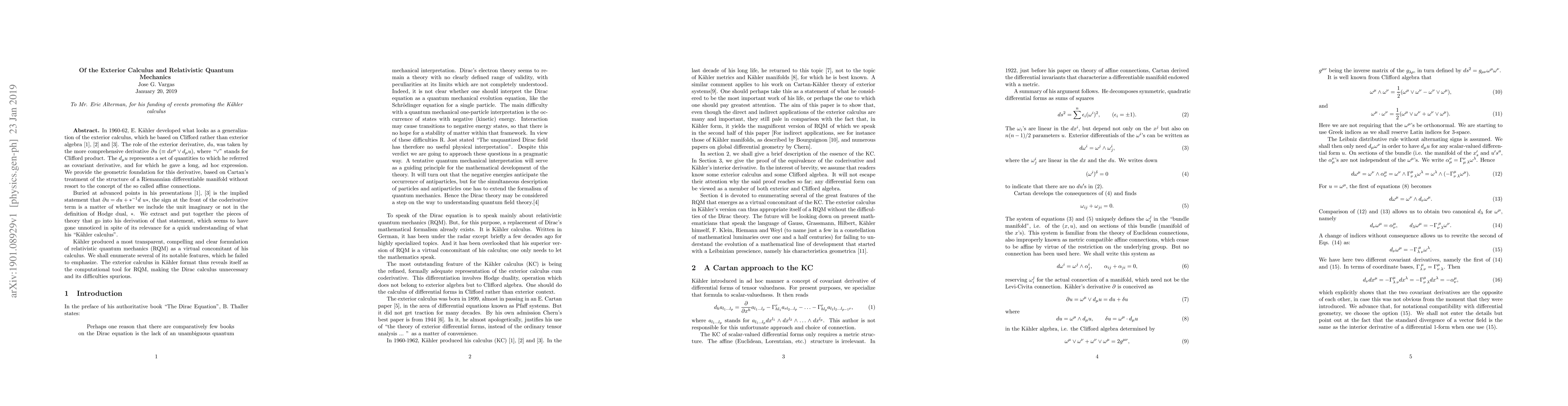 In 1960-62, E. K\"ahler developed what looks as a generalization of the exterior calculus, which he based on Clifford rather than exterior algebra. The role of\ the exterior derivative, $du$, was taken by the more comprehensive derivative $\partial u$ ($\equiv dx^{\mu }\vee d_{\mu }u$), where `$\vee $' stands for Clifford product. The $d_{\mu }u$ represents a set of quantities to which he referred as covariant derivative, and for which he gave a long, ad hoc expression. We provide the geometric foundation for this derivative, based on Cartan's treatment of the structure of a Riemannian differentiable manifold without resort to the concept of the so called affine connections. Buried at advanced points in his presentations is the implied statement that $\partial u=du+\ast ^{-1}d$ $u\ast $, the sign at the front of the coderivative term is a matter of whether we include the unit imaginary or not in the definition of Hodge dual, $\ast $. We extract and put together the pieces of theory that go into his derivation of that statement, which seems to have gone unnoticed in spite of its relevance for a quick understanding of what his `K\"ahler calculus'. K\"ahler produced a most transparent, compelling and clear formulation of relativistic quantum mechanics (RQM) as a virtual concomitant of his calculus. We shall enumerate several of its notable features, which he failed to emphasize. The exterior calculus in K\"ahler format thus reveals itself as the computational tool for RQM, making the Dirac calculus unnecessary and its difficulties spurious.