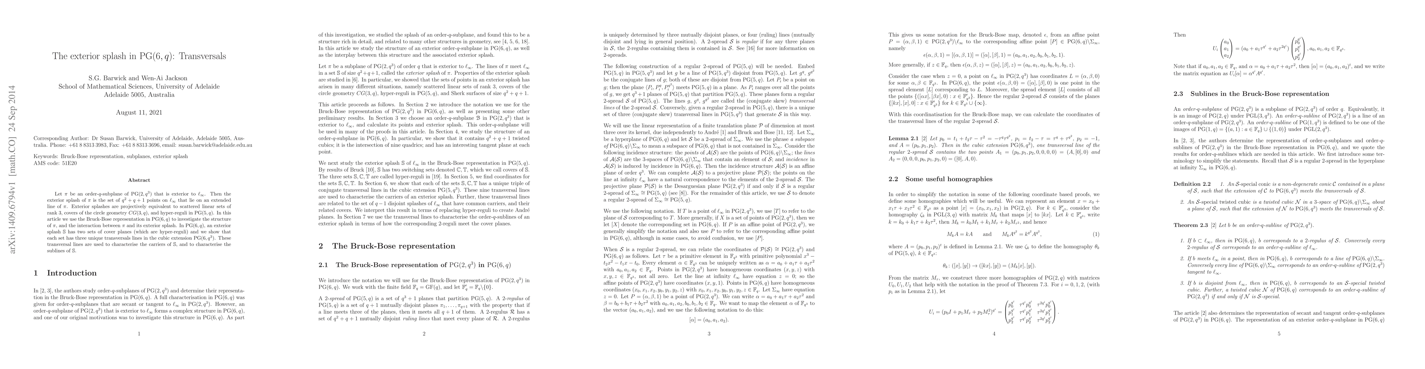 Let $\pi$ be an order-$q$-subplane of $PG(2,q^3)$ that is exterior to $\ell_\infty$. Then the exterior splash of $\pi$ is the set of $q^2+q+1$ points on $\ell_\infty$ that lie on an extended line of $\pi$. Exterior splashes are projectively equivalent to scattered linear sets of rank 3, covers of the circle geometry $CG(3,q)$, and hyper-reguli in $PG(5,q)$. In this article we use the Bruck-Bose representation in $PG(6,q)$ to investigate the structure of $\pi$, and the interaction between $\pi$ and its exterior splash. In $PG(6,q)$, an exterior splash $\mathbb S$ has two sets of cover planes (which are hyper-reguli) and we show that each set has three unique transversals lines in the cubic extension $PG(6,q^3)$. These transversal lines are used to characterise the carriers of $\mathbb S$, and to characterise the sublines of $\mathbb S$.