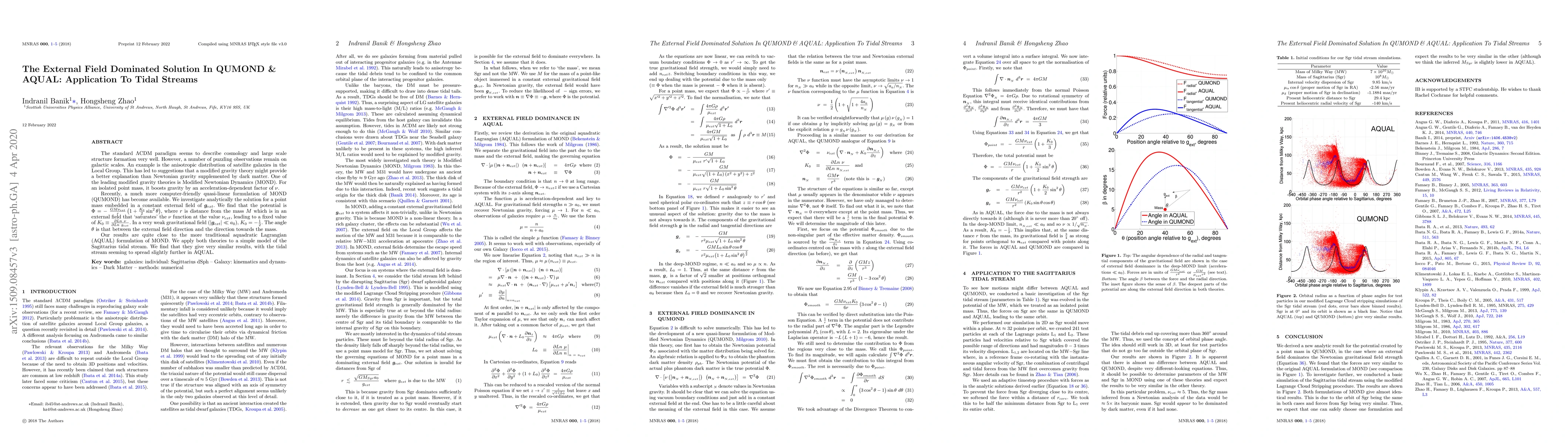 The standard $\Lambda$CDM paradigm seems to describe cosmology and large scale structure formation very well. However, a number of puzzling observations remain on galactic scales. An example is the anisotropic distribution of satellite galaxies in the Local Group. This has led to suggestions that a modified gravity theory might provide a better explanation than Newtonian gravity supplemented by dark matter. One of the leading modified gravity theories is Modified Newtonian Dynamics (MOND). For an isolated point mass, it boosts gravity by an acceleration-dependent factor of $\nu$. Recently, a much more computer-friendly quasi-linear formulation of MOND (QUMOND) has become available. We investigate analytically the solution for a point mass embedded in a constant external field of $\mathbf{g}_{ext}$. We find that the potential is $\Phi = - ~ \frac{GM \nu_{ext}}{r}\left(1 + \frac{K_0}{2} \sin^2 \theta \right)$, where $r$ is distance from the mass $M$ which is in an external field that `saturates' the $\nu$ function at the value $\nu_{ext}$, leading to a fixed value of $K_0 \equiv \frac{\partial Ln ~ \nu}{\partial Ln ~ g_{ext}}$. In a very weak gravitational field $\left(\left| \mathbf{g}_{ext} \right| \ll a_0 \right)$, $K_0 = -\frac{1}{2}$. The angle $\theta$ is that between the external field direction and the direction towards the mass. Our results are quite close to the more traditional aquadratic Lagrangian (AQUAL) formulation of MOND. We apply both theories to a simple model of the Sagittarius tidal stream. We find that they give very similar results, with the tidal stream seeming to spread slightly further in AQUAL.