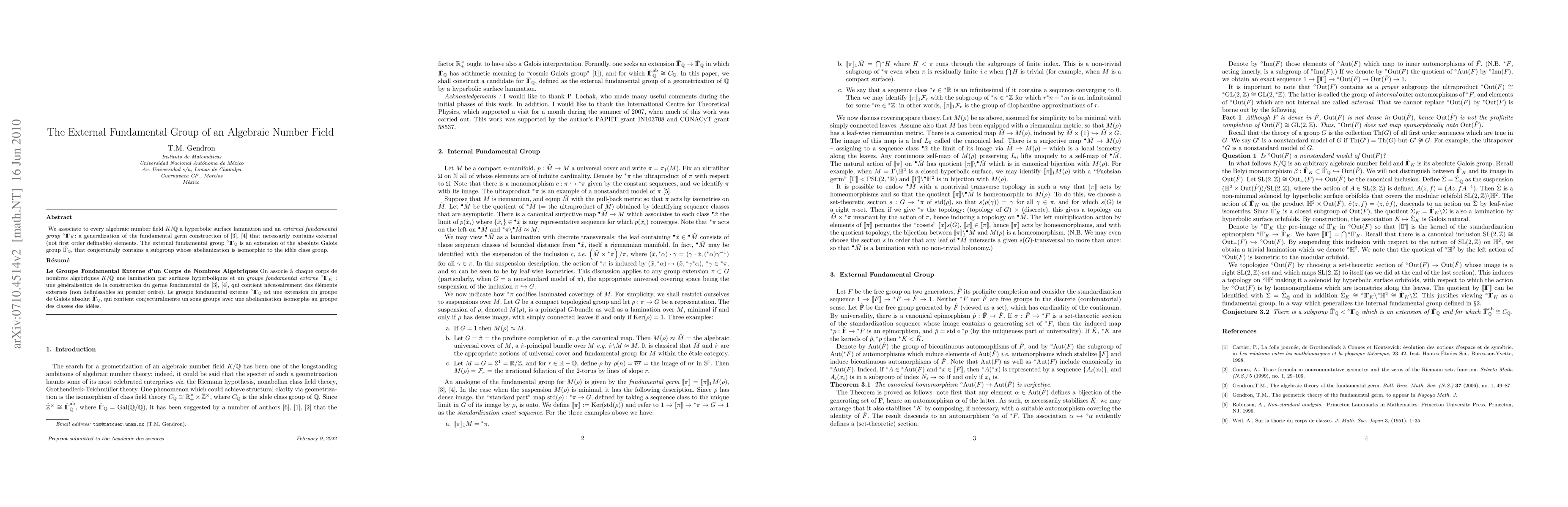 This paper introduces the concept of an external fundamental group for algebraic number fields, generalizing the fundamental germ to include non-first-order definable elements. It conjectures that the external fundamental group of rationals contains a subgroup whose abelianization is isomorphic to the idele class group.