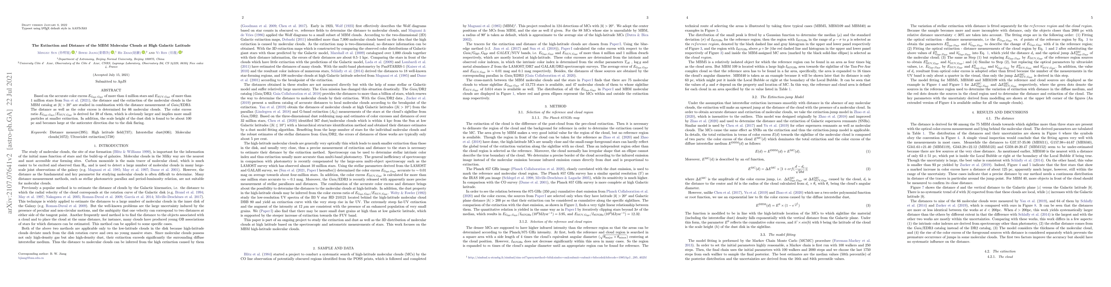 This study determines the distance and extinction of 66 MBM molecular clouds at high galactic latitudes using color excess data from Gaia and other sources. The analysis reveals a larger color excess ratio for 39 clouds, indicating smaller particles and higher extinction, while the dust disk's scale height is found to be approximately 100 pc, flaring significantly in the anticenter direction.