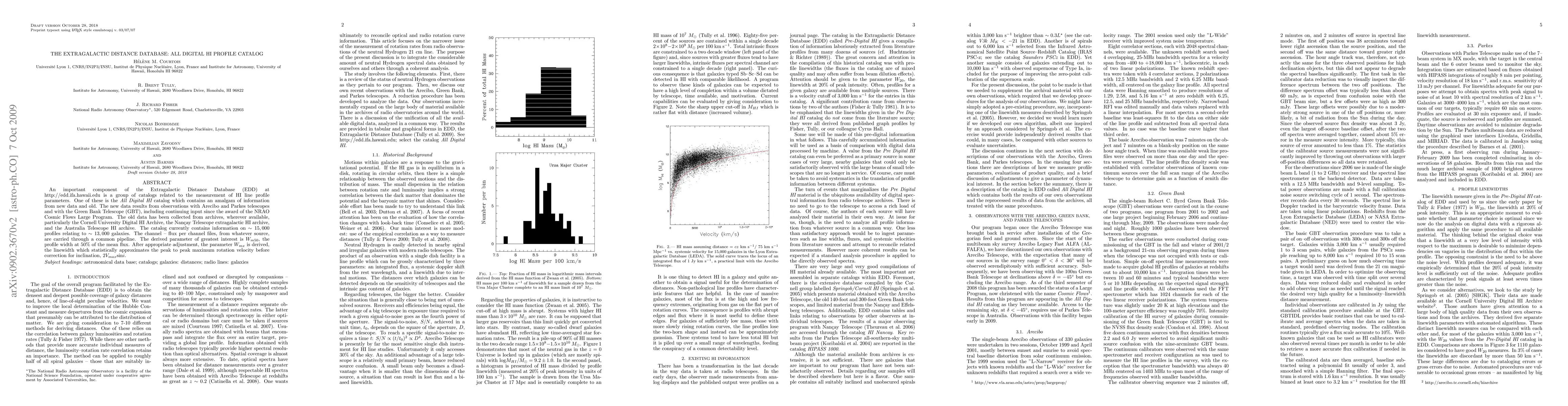 The Extragalactic Distance Database's All Digital HI catalog amalgamates new data from Arecibo, Parkes, and GBT telescopes with archival data from Cornell, Nancay, and Australia, encompassing ~15,000 profiles for ~13,000 galaxies. The key parameter derived is W_mx, the linewidth approximating the peak rotation velocity before inclination correction.