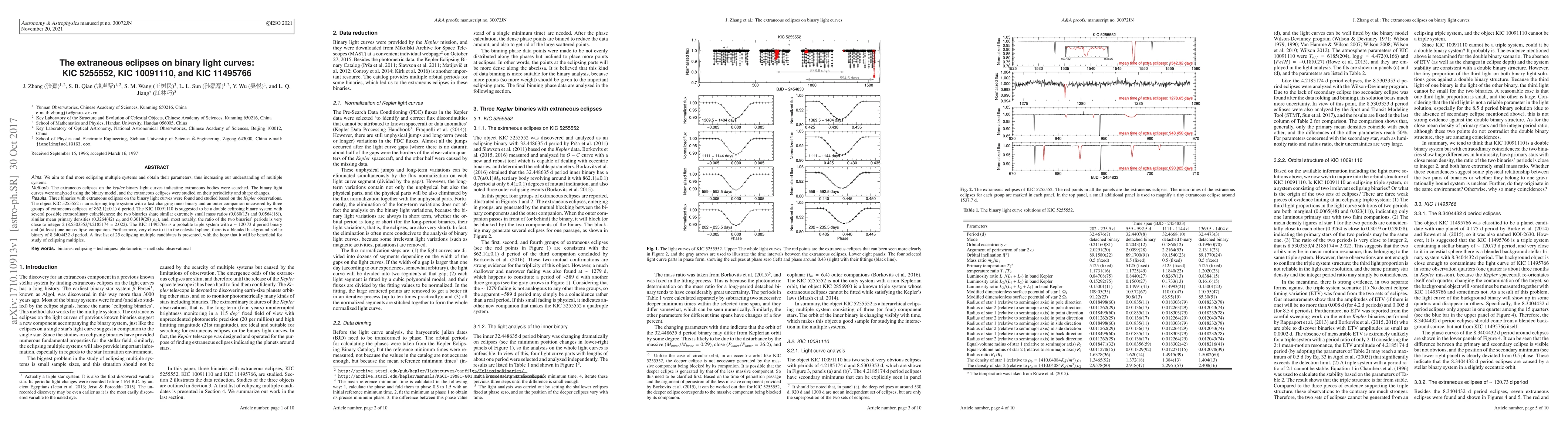 Aims. We aim to find more eclipsing multiple systems and obtain their parameters, thus increasing our understanding of multiple systems. Methods. The extraneous eclipses on the \textit{kepler} binary light curves indicating extraneous bodies were searched. The binary light curves were analyzed using the binary model, and the extraneous eclipses were studied on their periodicity and shape changes. Results. Three binaries with extraneous eclipses on the binary light curves were found and studied based on the \textit{Kepler} observations. The object KIC 5255552 is an eclipsing triple system with a fast changing inner binary and an outer companion uncovered by three groups of extraneous eclipses of $862.1(\pm0.1)$ d period. The KIC 10091110 is suggested to be a double eclipsing binary system with several possible extraordinary coincidences: the two binaries share similar extremely small mass ratios ($0.060(13)$ and $0.0564(18)$), similar mean primary densities ($0.3264(42)\;\rho_\odot$ and $0.3019(28)\;\rho_\odot$), and, most notably, the ratio of the two binaries' periods is very close to integer 2 (8.5303353/4.2185174 = 2.022). The KIC 11495766 is a probable triple system with a $\sim120.73$ d period binary and (at least) one non-eclipse companion. Furthermore, very close to it in the celestial sphere, there is a blended background stellar binary of 8.3404432 d period. A first list of 25 eclipsing multiple candidates is presented, with the hope that it will be beneficial for study of eclipsing multiples.
