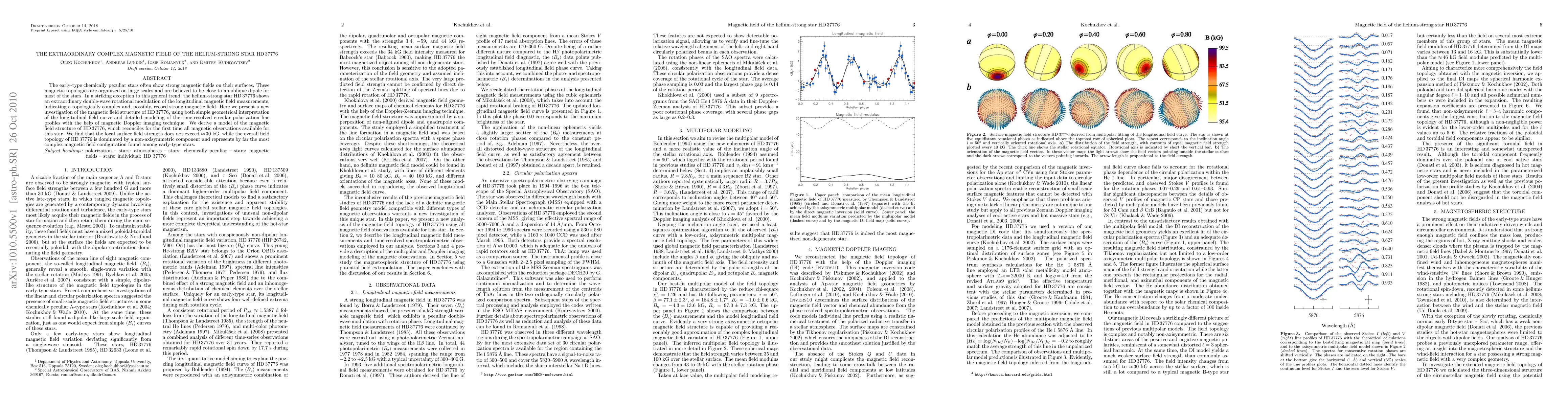 The helium-strong star HD 37776 exhibits an extraordinary complex magnetic field, with a non-axisymmetric topology and a double-wave rotational modulation, making it the most complex magnetic field configuration found among early-type stars, despite local surface field strengths not exceeding ~30 kG.