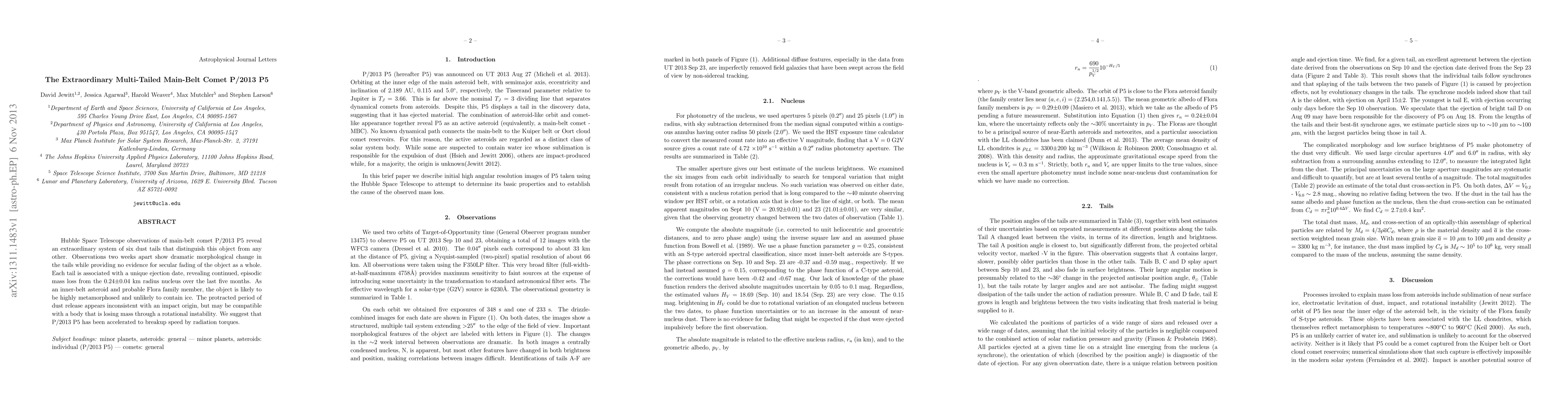 This paper reports on Hubble Space Telescope observations of the main-belt comet P/2013 P5, revealing six dust tails and episodic mass loss over five months, suggesting rotational instability rather than impact. The comet's unusual morphology and lack of secular fading indicate it may have been accelerated to breakup speed by radiation torques.