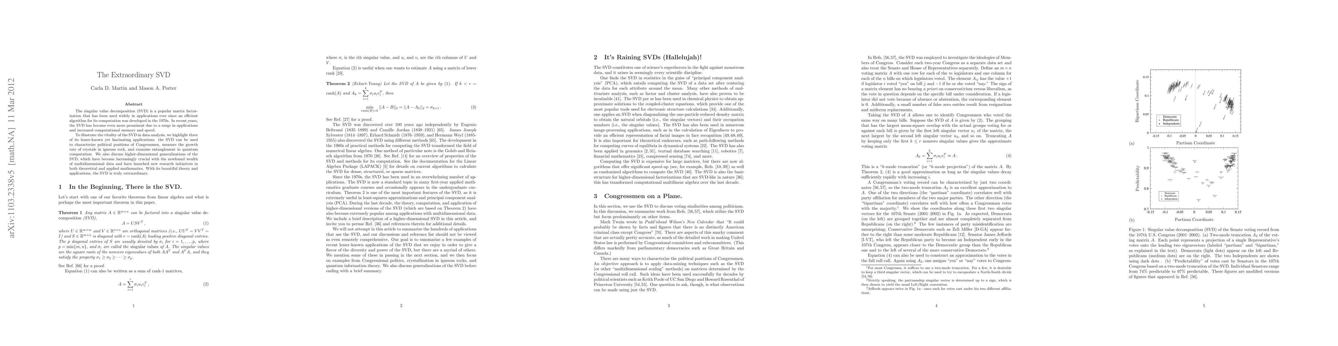 The singular value decomposition (SVD) is a powerful matrix factorization technique widely used in data analysis, with recent applications in characterizing political positions, measuring crystal growth, and examining quantum entanglement. Its importance has surged with advancements in computational power and the availability of multidimensional data.