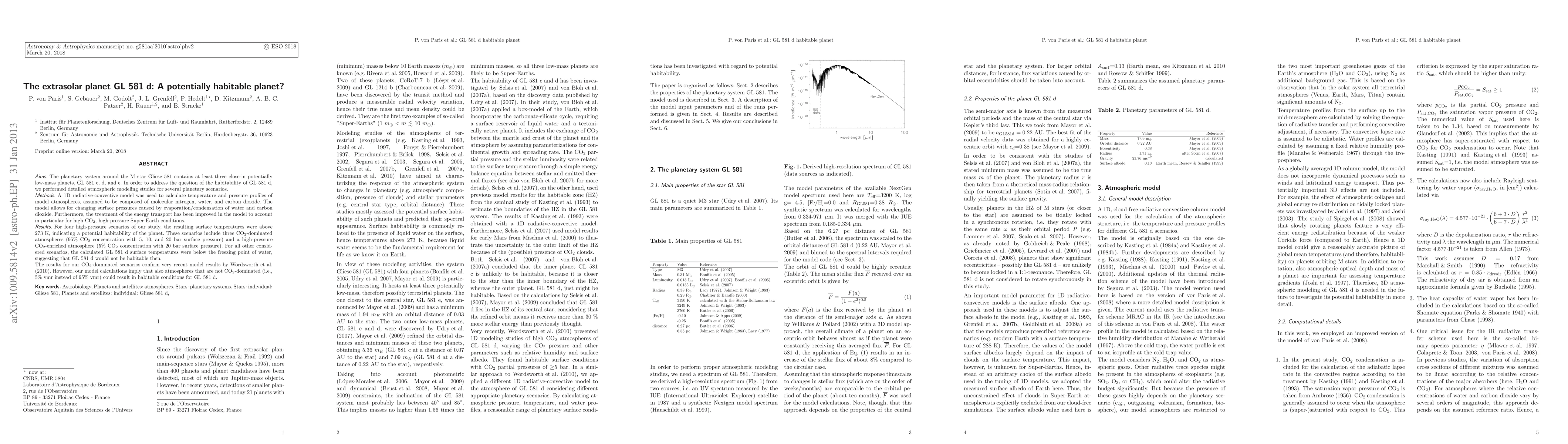 The study explores the potential habitability of the extrasolar planet GL 581 d using detailed atmospheric modeling, finding that high-pressure CO2-dominated atmospheres could maintain surface temperatures above freezing, suggesting possible habitability. Other scenarios with lower CO2 concentrations did not support habitability.