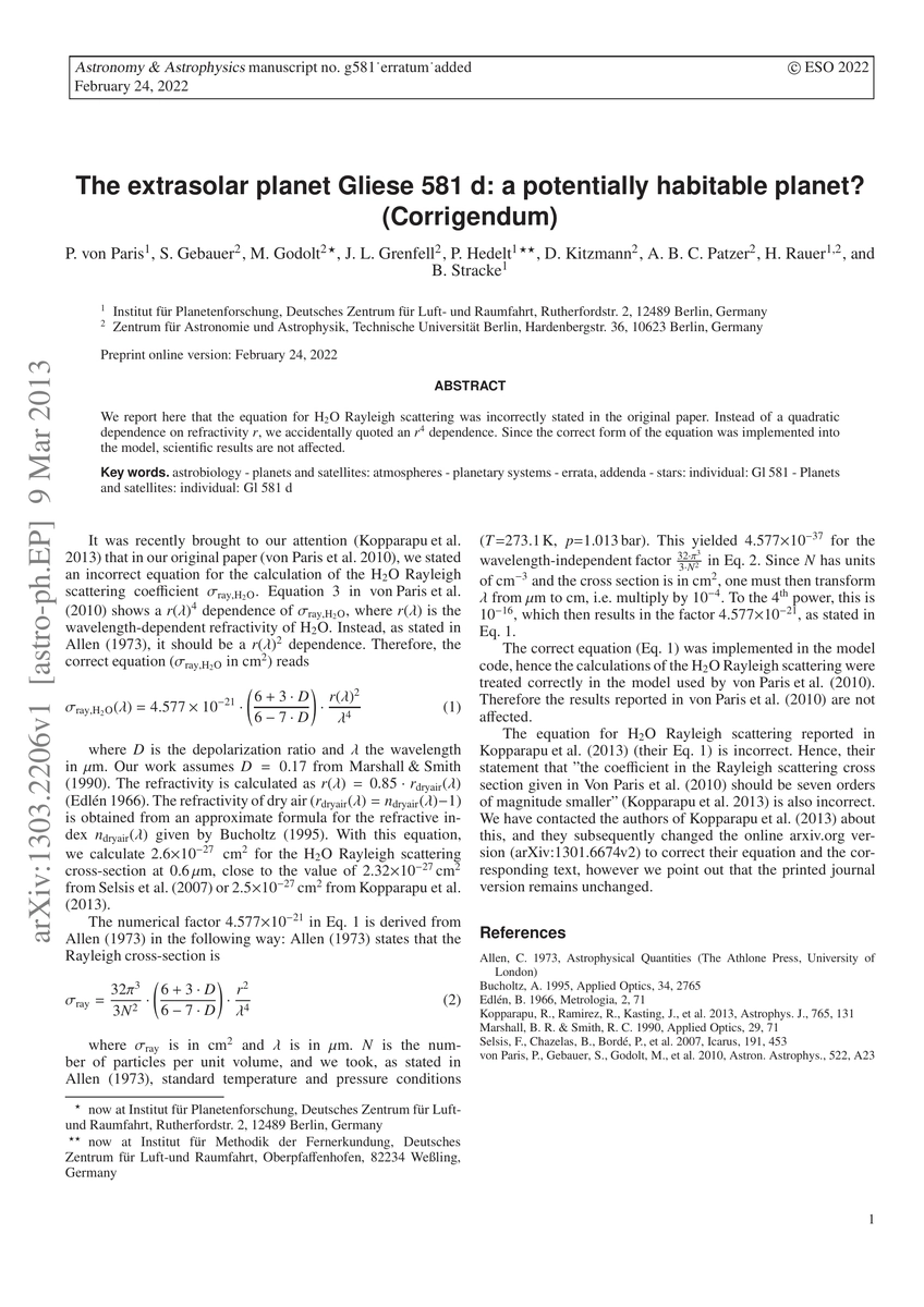 The Gliese 581 d planet was found to have a potentially habitable environment after an error in calculations was corrected, but the correct findings are unaffected.